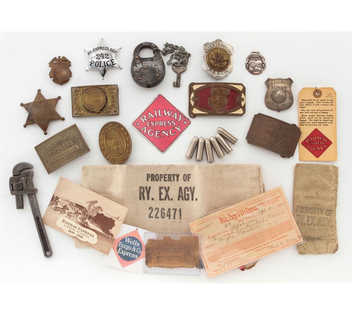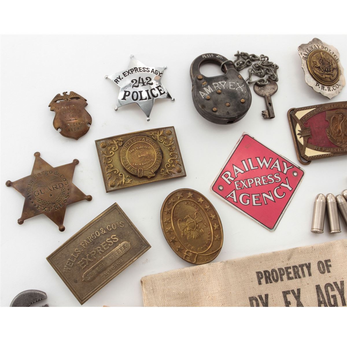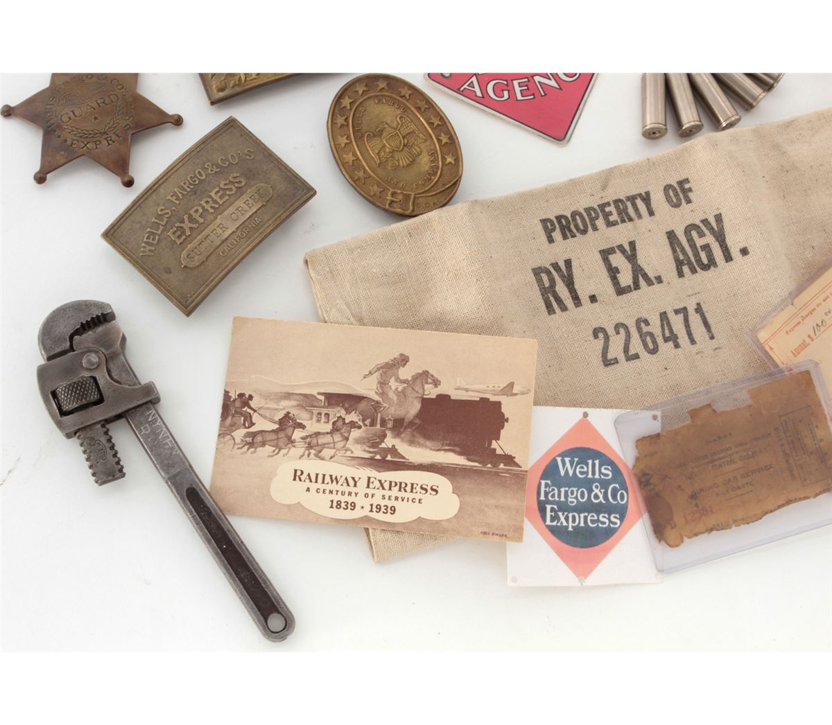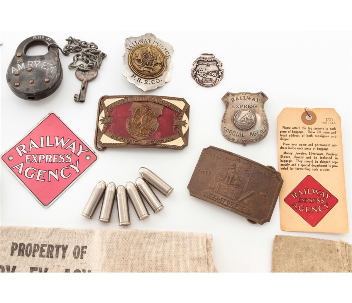 Lot of Wells Fargo and Railway Express Memorabilia: (1) Beautiful vintage ''Express Wells Fargo Y Cia Republica Mexicana since 1852'' belt buckle, marked ''Made in England'', mfg'd by Bay State Jewelry and Silversmiths Co., also marked ''Warranted Finest Minted Brass''. (2) Wells Fargo Western Division belt buckle, stamped ''Tiffany & Co.''. (3) Three additional Wells Fargo & Co. belt buckles. (6) Lot of 5 Wells Fargo and Railway Express Guard and Special Agent marked badges. (7) Lot of two Ry. Ex. Agy. marked money bags. (8) ''Am. Ry. Ex.'' marked padlock with original key and chain. (9) Wells Fargo & Co. Express receipt, dated April 4, 1895. (10) Railway Express Agency baggage tag. (11) Railroad dining car service ticket. (12) 5 REA marked blanks. (13) Bag sealer. All in good condition. Est.: $300-$500/lot.
