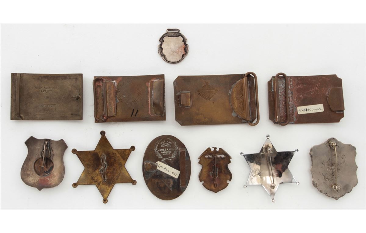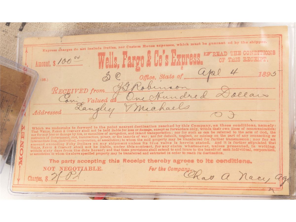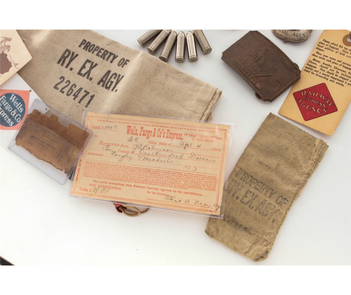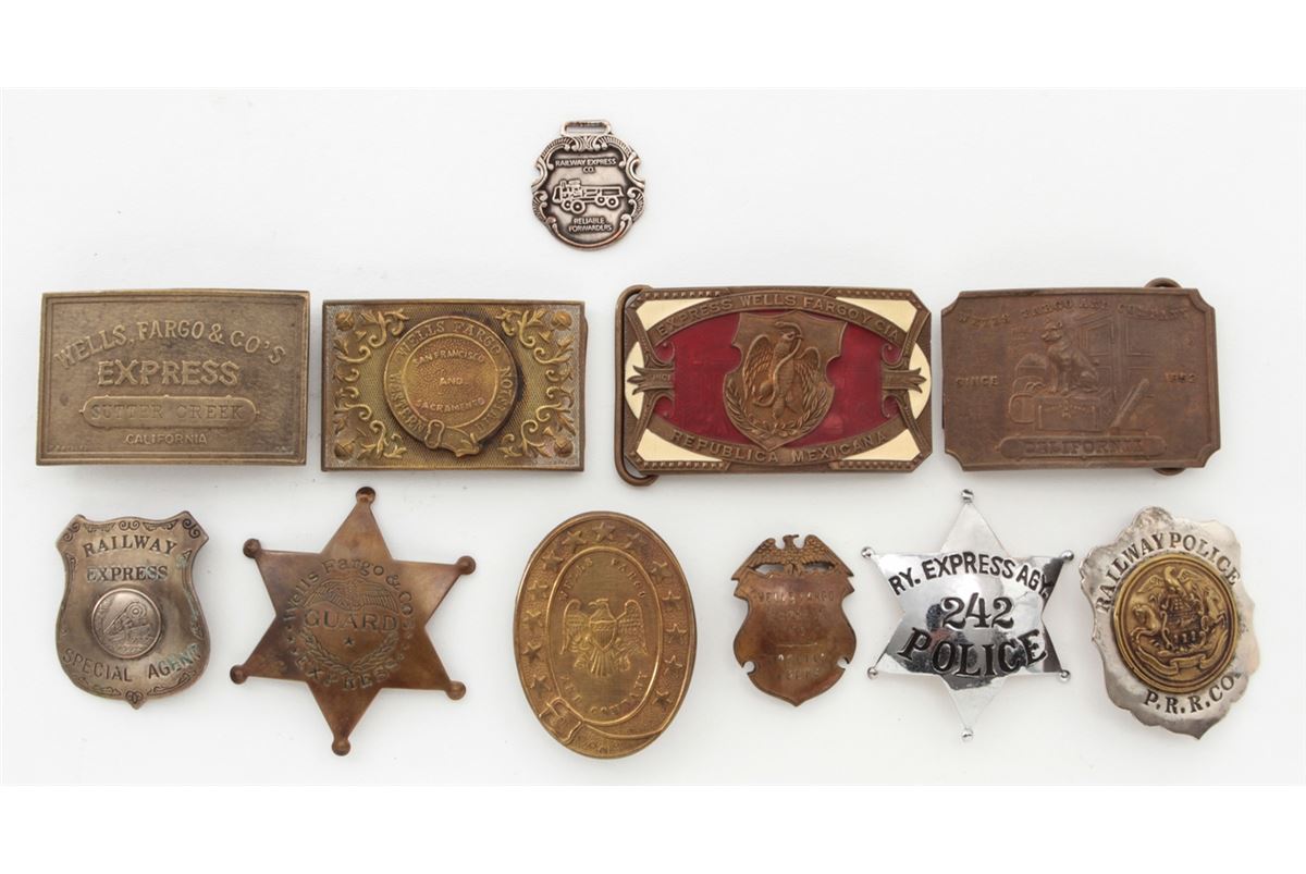 Lot of Wells Fargo and Railway Express Memorabilia: (1) Beautiful vintage ''Express Wells Fargo Y Cia Republica Mexicana since 1852'' belt buckle, marked ''Made in England'', mfg'd by Bay State Jewelry and Silversmiths Co., also marked ''Warranted Finest Minted Brass''. (2) Wells Fargo Western Division belt buckle, stamped ''Tiffany & Co.''. (3) Three additional Wells Fargo & Co. belt buckles. (6) Lot of 5 Wells Fargo and Railway Express Guard and Special Agent marked badges. (7) Lot of two Ry. Ex. Agy. marked money bags. (8) ''Am. Ry. Ex.'' marked padlock with original key and chain. (9) Wells Fargo & Co. Express receipt, dated April 4, 1895. (10) Railway Express Agency baggage tag. (11) Railroad dining car service ticket. (12) 5 REA marked blanks. (13) Bag sealer. All in good condition. Est.: $300-$500/lot.