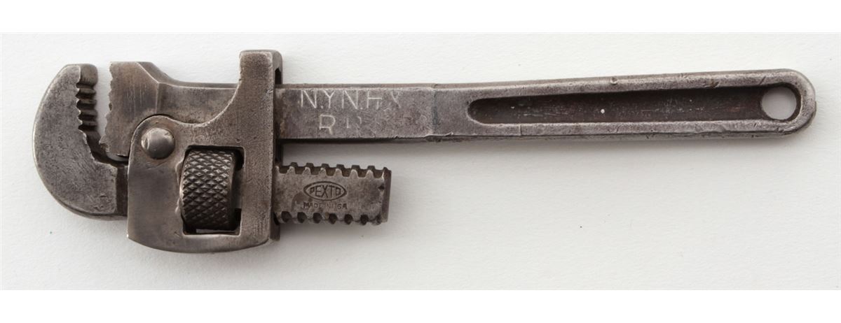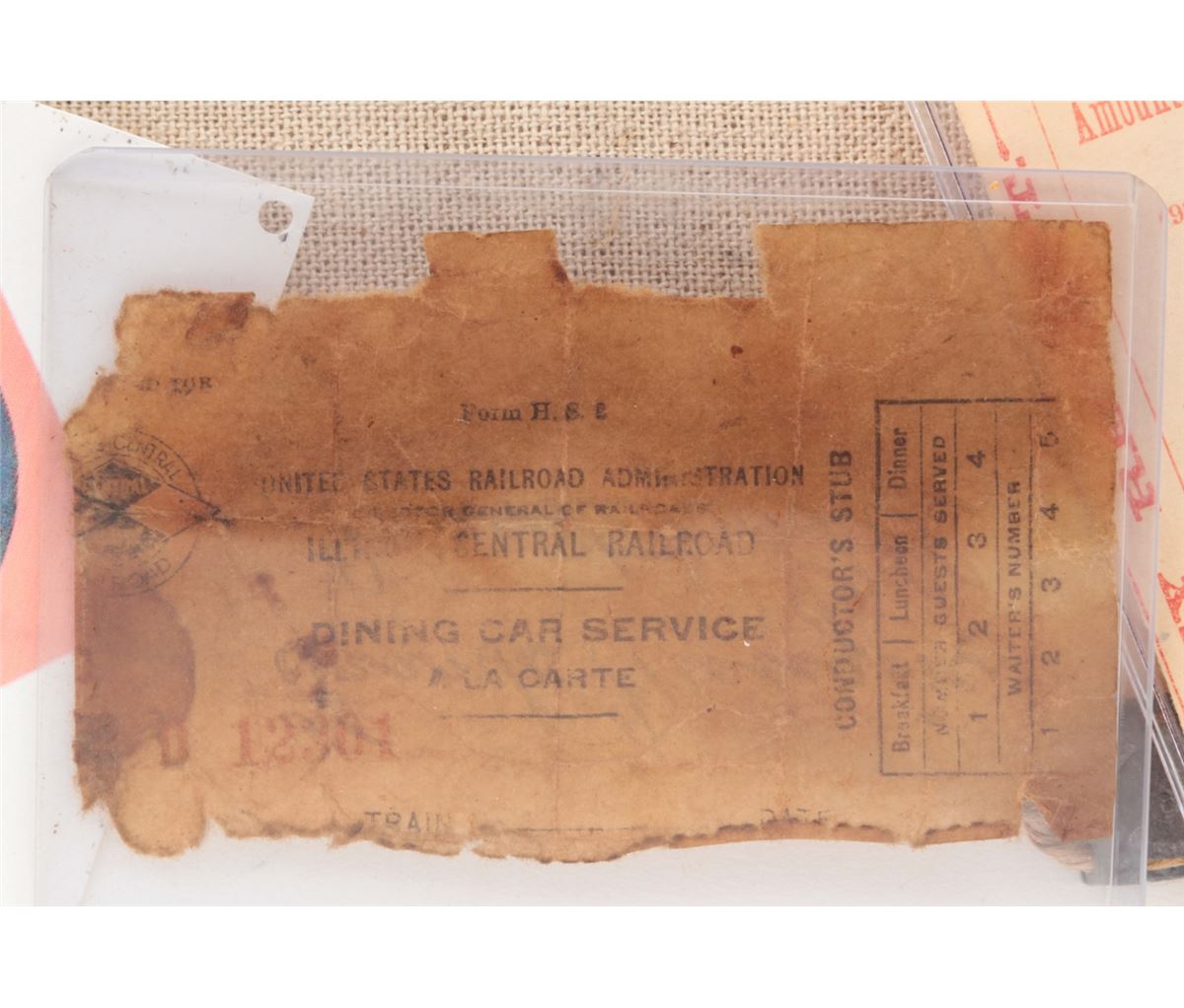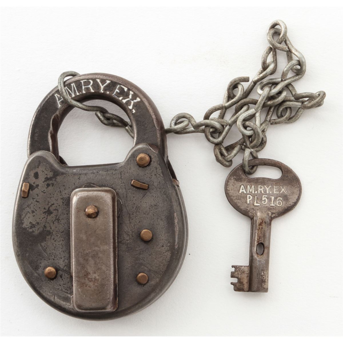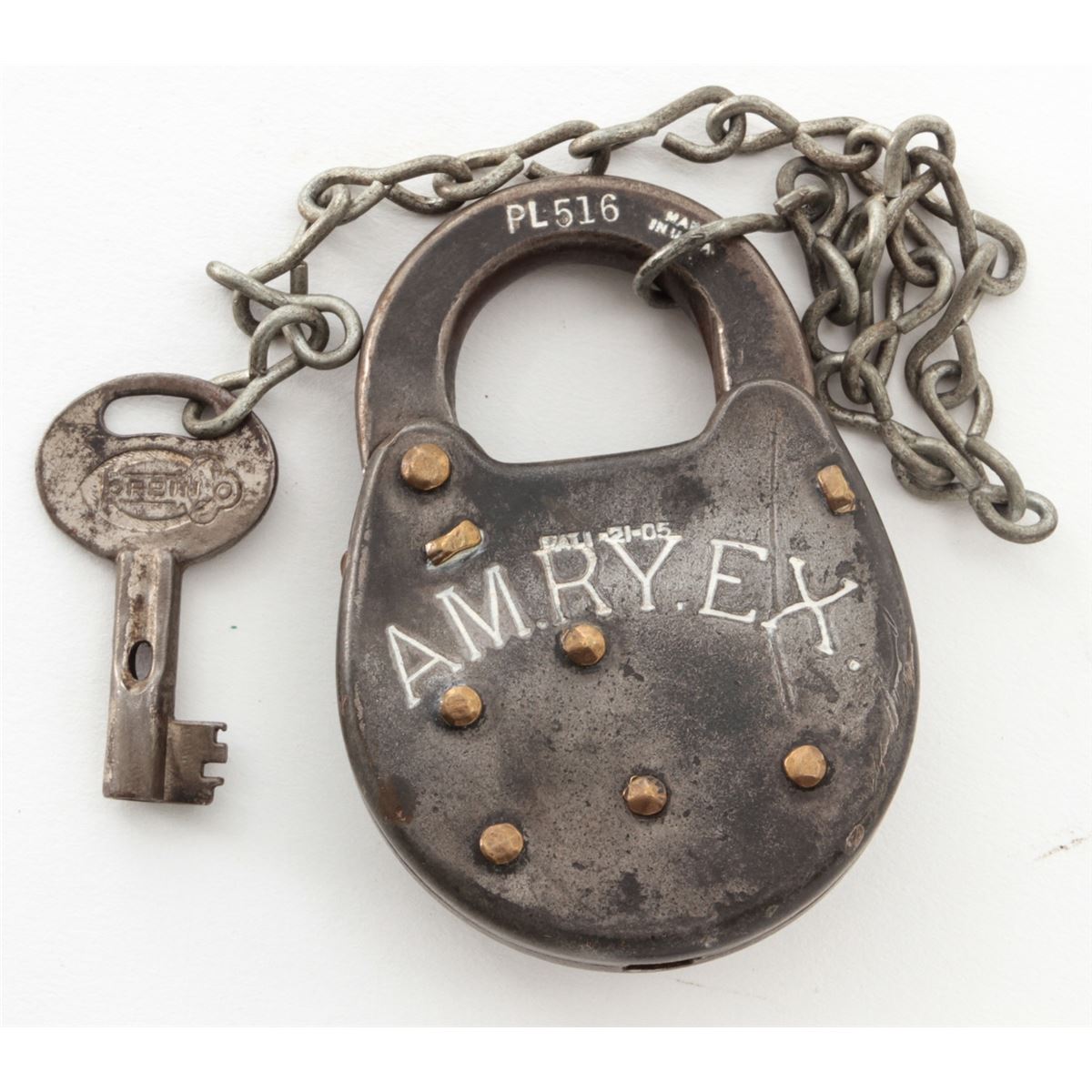 Lot of Wells Fargo and Railway Express Memorabilia: (1) Beautiful vintage ''Express Wells Fargo Y Cia Republica Mexicana since 1852'' belt buckle, marked ''Made in England'', mfg'd by Bay State Jewelry and Silversmiths Co., also marked ''Warranted Finest Minted Brass''. (2) Wells Fargo Western Division belt buckle, stamped ''Tiffany & Co.''. (3) Three additional Wells Fargo & Co. belt buckles. (6) Lot of 5 Wells Fargo and Railway Express Guard and Special Agent marked badges. (7) Lot of two Ry. Ex. Agy. marked money bags. (8) ''Am. Ry. Ex.'' marked padlock with original key and chain. (9) Wells Fargo & Co. Express receipt, dated April 4, 1895. (10) Railway Express Agency baggage tag. (11) Railroad dining car service ticket. (12) 5 REA marked blanks. (13) Bag sealer. All in good condition. Est.: $300-$500/lot.