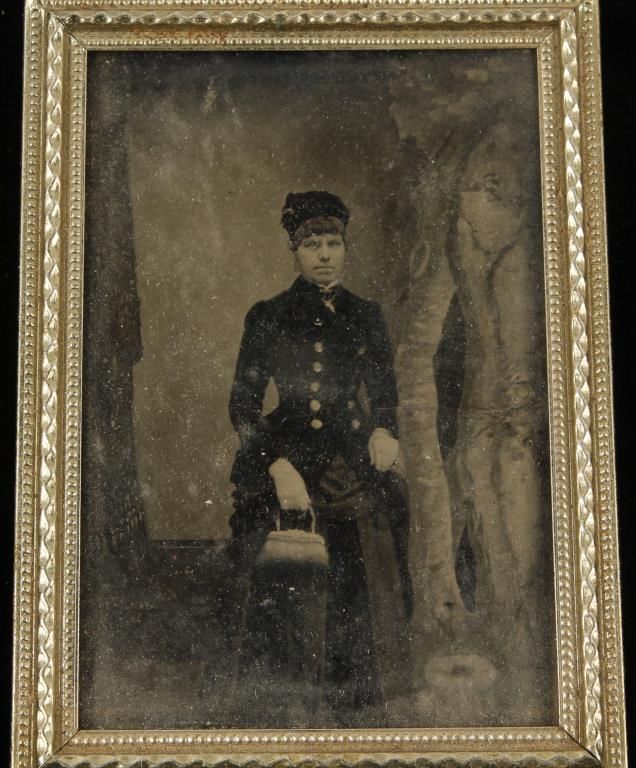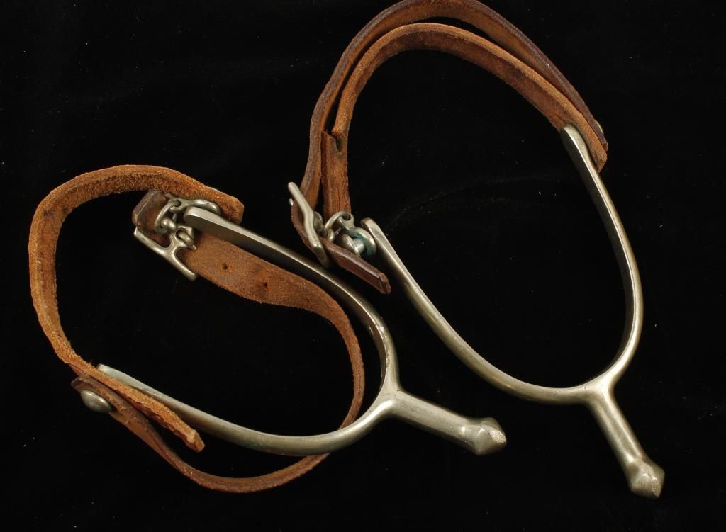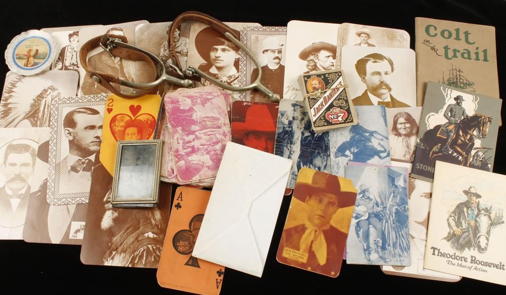 Many post cards with photos of eminent western people. 3 small pamphlets of eminent US historic people and acts. A small framed tintype of Lena Bergdoll Weghorst, aged 19. A deck of Jack Daniels playing cards. A pair of US Cavalry spurs. A small ceramic souvenir from Punxsutawney, PA.