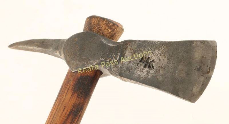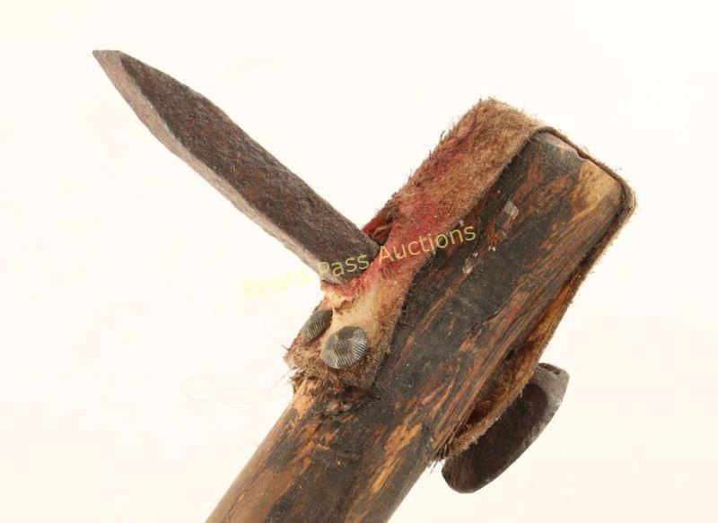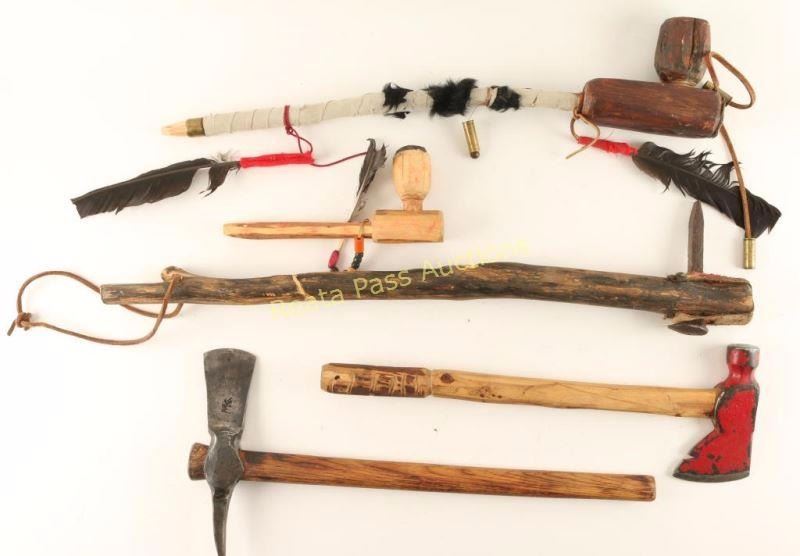 Including; hand forged iron tomahawk, antique hatchet, Apache war club with miner spike, a large and a small peace pipe, and a Western costume bandana for Cavalry.