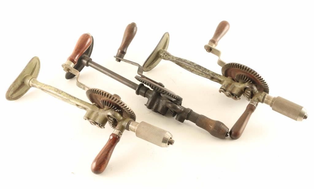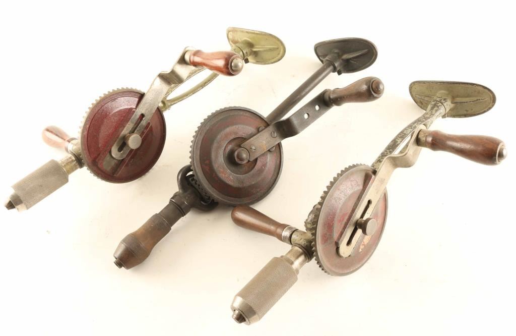 Includes (2) No. 8733 Breast Drills, both in good condition, and (1) No. 8744 Breast Drill with no second handle, in as found good condition.