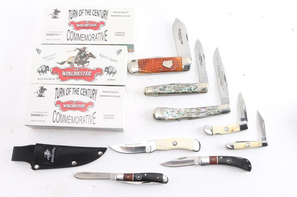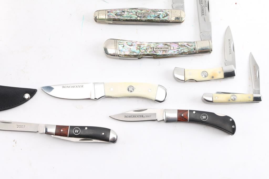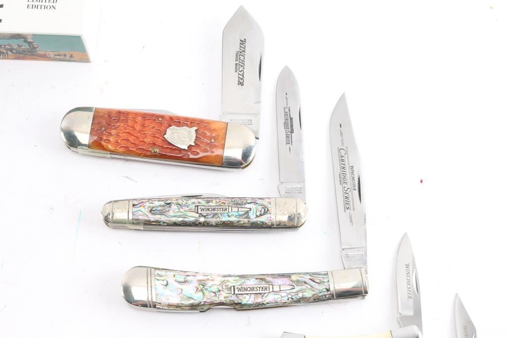 Lot of 8 Winchester knives. 1 fixed blade and 7 folders. The 3 larger knives are (1) burnt orange bone and (2) abalone.