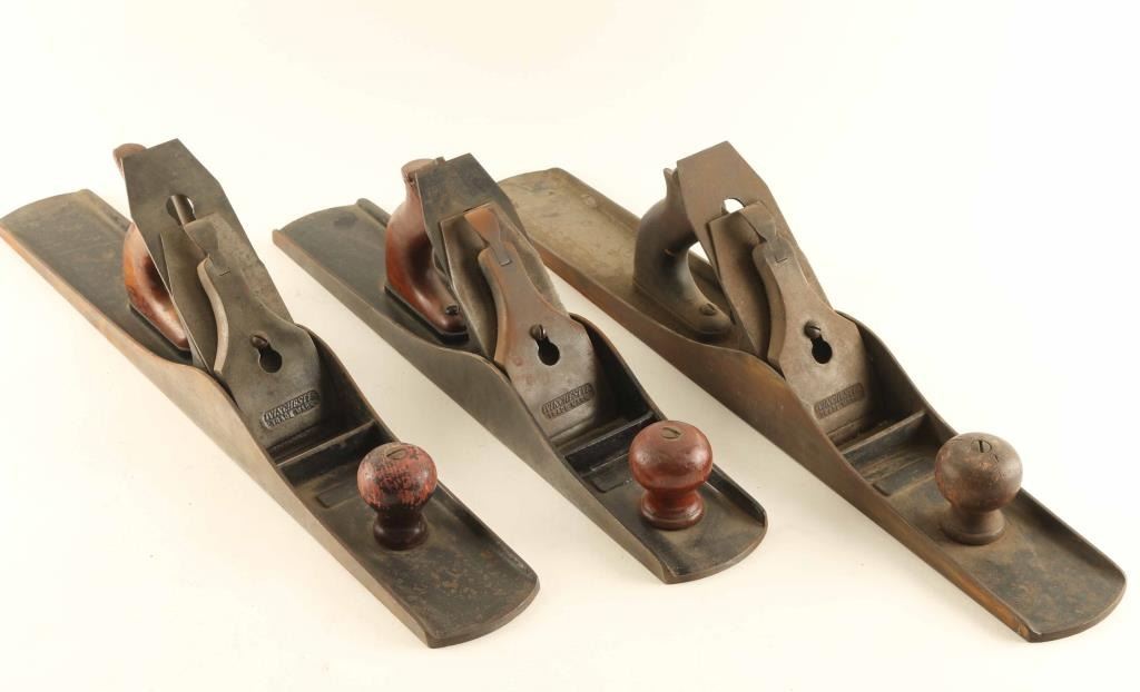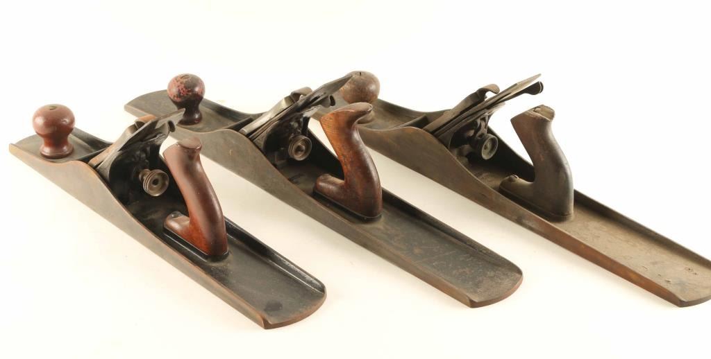 Includes (2) Winchester No. 3035 Planes measuring 21" long and 2 7/8" wide, features an iron frame, handle and varnished knob, and (1) Winchester No. 3015 Plane measuring 18" long and 2 7/8" wide, featuring screw adjustment, iron frame.