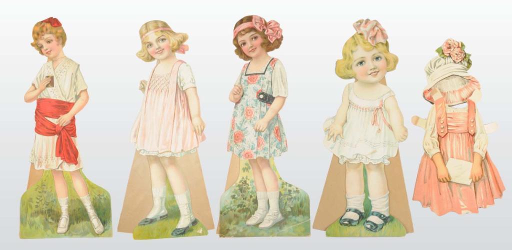 Description 1913 to 1919. A large lot of 21-inch heavy cardboard dolls. Including "Curly Locks" and "Dolly Dimple". The sets are played with and some are incomplete. Good condition.