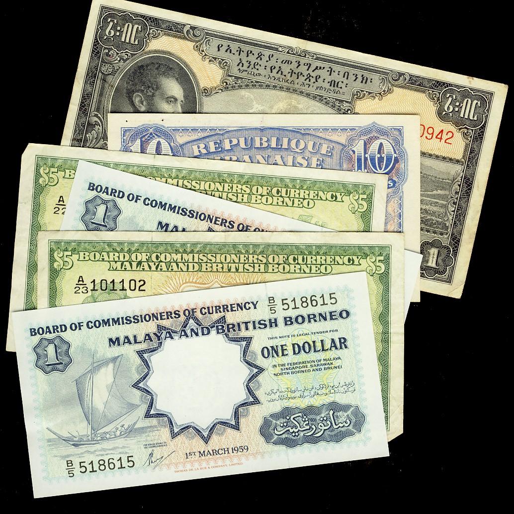 Lot of World Banknotes. Includes Ethiopia $1.00 note 1945 in VF/EF, Pick # 12 & Lebanon 10 Piastres note 1948 in EF, Pick #41. Malaya & British Borneo $1.00 note 1959 in EF, Pick # 8b & $.00 note 1953 in VF, Pick # 2 and Malaya & British Borneo $1.00 note 1959 in EF, Pick # 8b & $.00 note 1953 in VF, Pick # 2