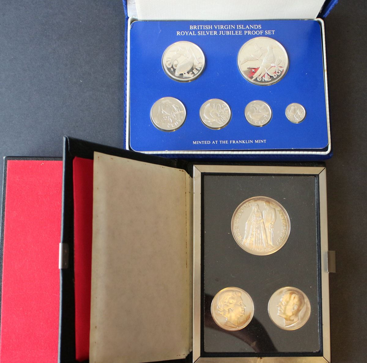 Lot of 2: 1977 British Virgin Islands Royal Silver Jubilee Coinage (all 6 Proof coins are Sterling Silver - Franklin Mint); 1947-1972 Royal Silver Wedding Anniversary set of 3 Sterling Silver Medals w/some toning (Paramount International Coin Corporation / Franklin Mint)