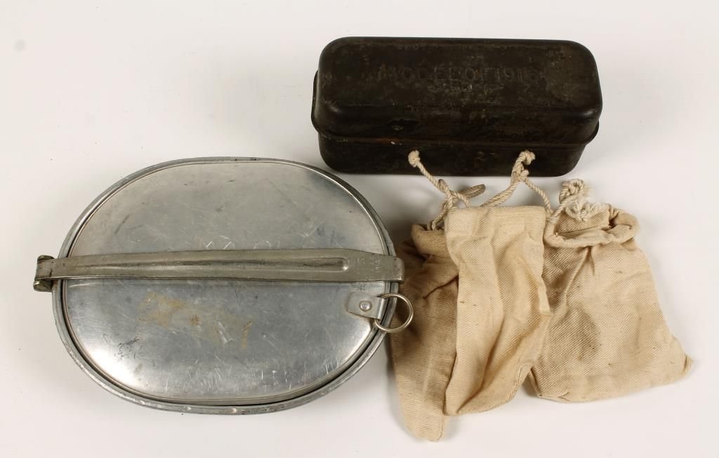 (1) 1918 meat can. Soldiers would eat their rations from these M1910 meat cans, also known as the mess kit. In overall good condition, shows use and various initials have been carved on the base. (1) Model 1916 bacon tin. Shows age but in overall fair condition. (3) U.S. Calvary unissued condiment bags, circa 1885-1910.