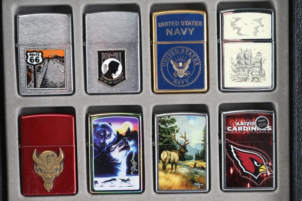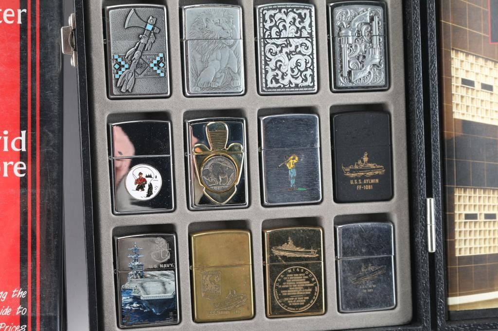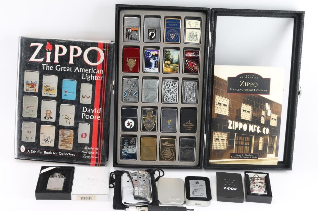 Includes: (3) Books - Zippo Lighters Field Guide, Zippo - The Great American Lighter, Images of America - Zippo Manufacturing Company. (24) Zippo lighters - POW, Navy, Route 66, AZ Cardinals, Buffalo Nickel, S&W, and more. (1) Zippo hand warmer.