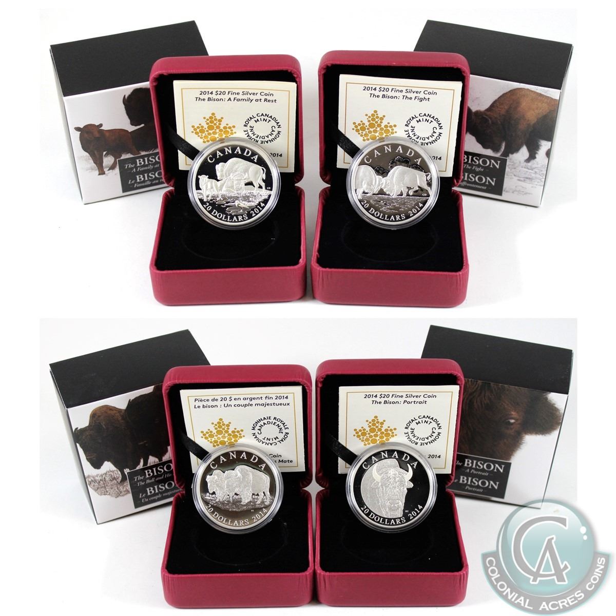 Lot of all 4x 2014 Canada $20 The Bison Fine Silver Coins - A Family at Rest, The Bull and His Mate, The Fight & A Portrait. 4pcs (TAX Exempt)