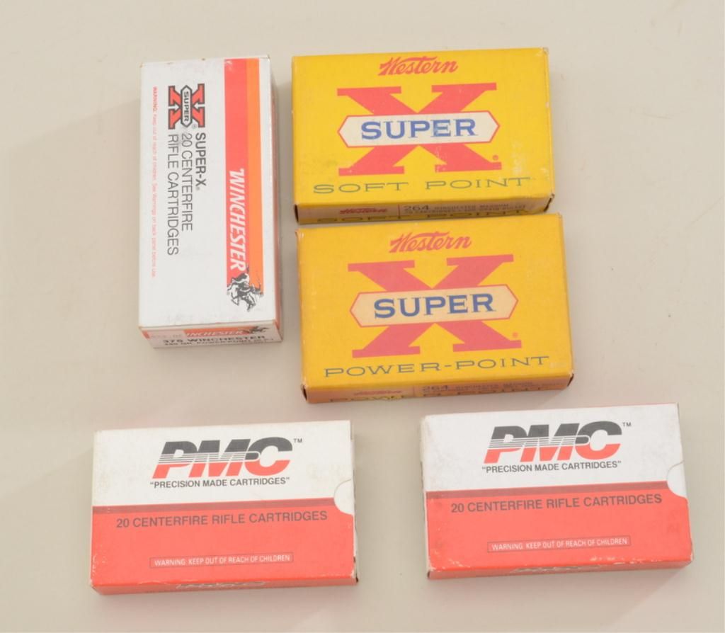 Lot of ammo consisting of 2 boxes of PMC 30-30 Win., 2 boxes of Win. Super X .264 Win. and 1 box of Win. Super X .375 Win. Est.: $50-$75.