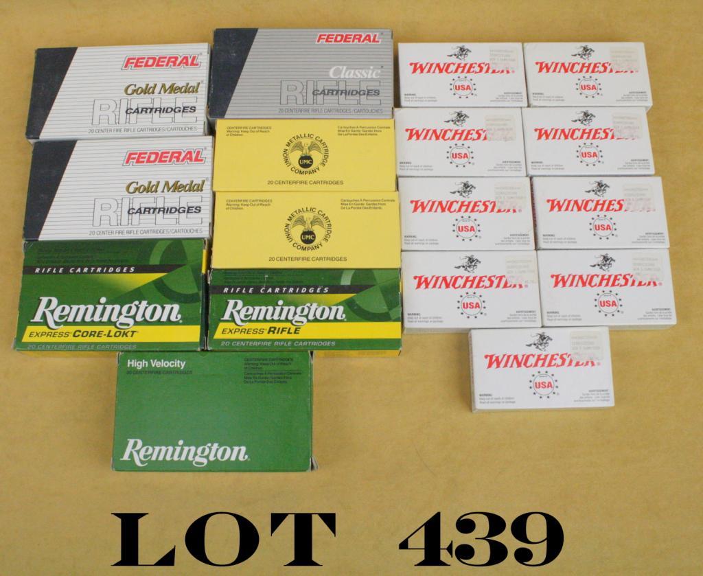 Lot of ammo including 9 boxes (20 rounds each) of Winchester 5.56mm caliber, 5 boxes (20 rounds each) of 30-06 Springfield caliber by Remington and Federal and three boxes of .223 Remington (20 rounds each) by UMC andRemington. Est.: $50-$75.