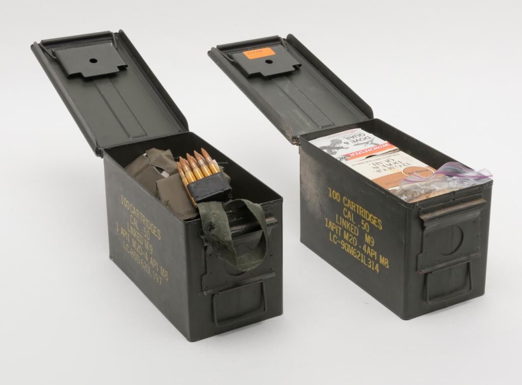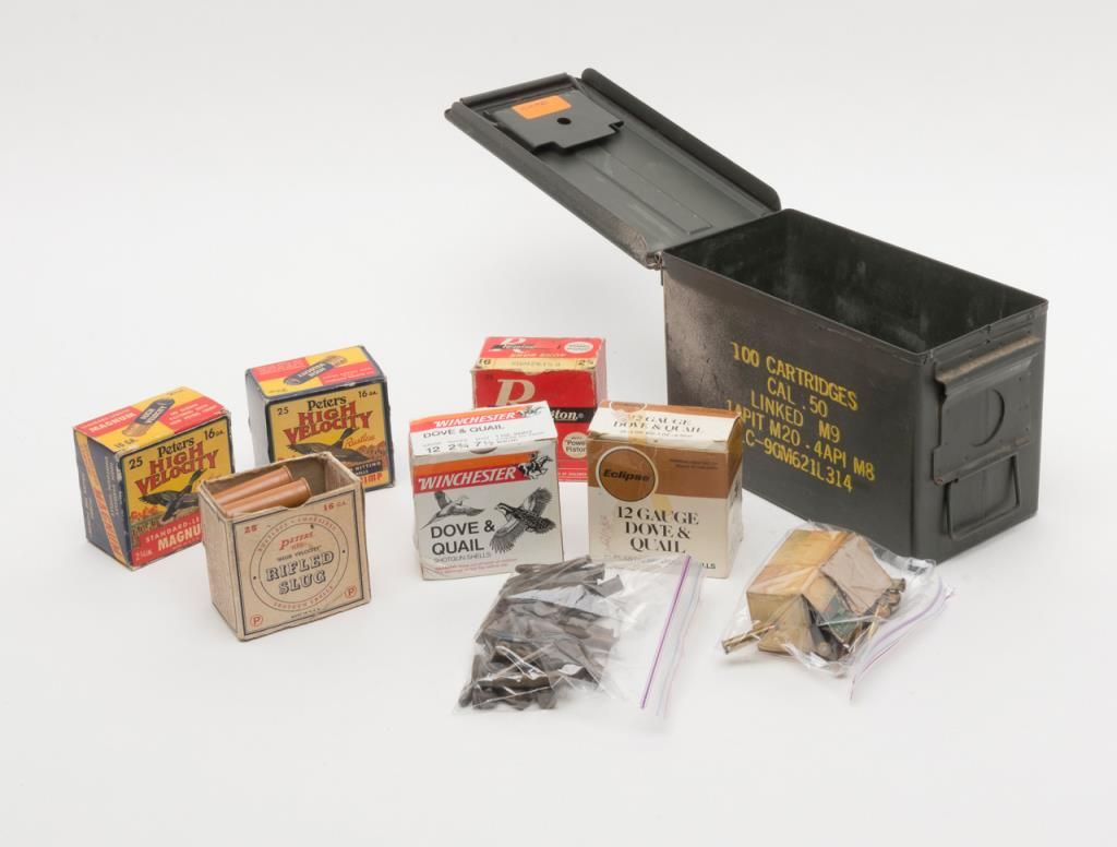 Lot of ammo including a military ammo can of M1 Garand bandoliers holding 30 8-round clips of .30 cal. cartridges; another military ammo can holding six boxes of misc. shotgun shells by different makers, some full, some partial, some mixed; apartial box of Rem-UMC .25-20 rounds and a bag of misc. individual misc. collector rounds including .30 WCF., .30 Army, .45 ACP, etc. Est.: $100-$200.