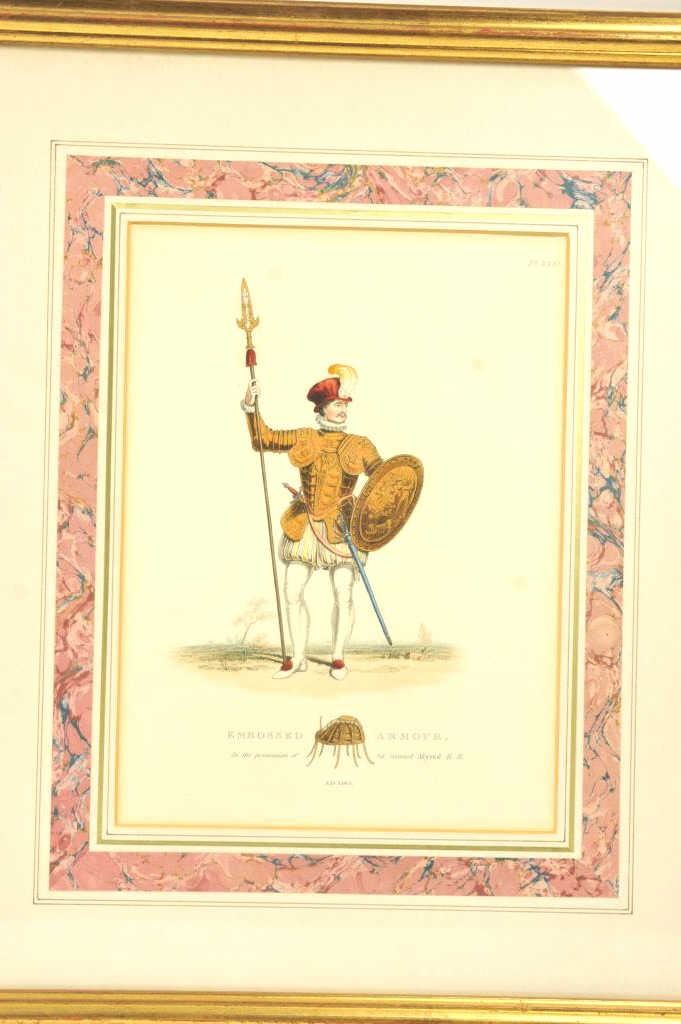 Lot of antique Italian prints of men in armor with arms. Expensively framed and matted to match at a cost of over $300 each. $1,200 in frames alone. The size of the outside dimensions is 21 ¼” in height by 19 ¼” inwidth, excellent overall condition and an excellent gift for the collector. A set of four. Est.: $400-$800.