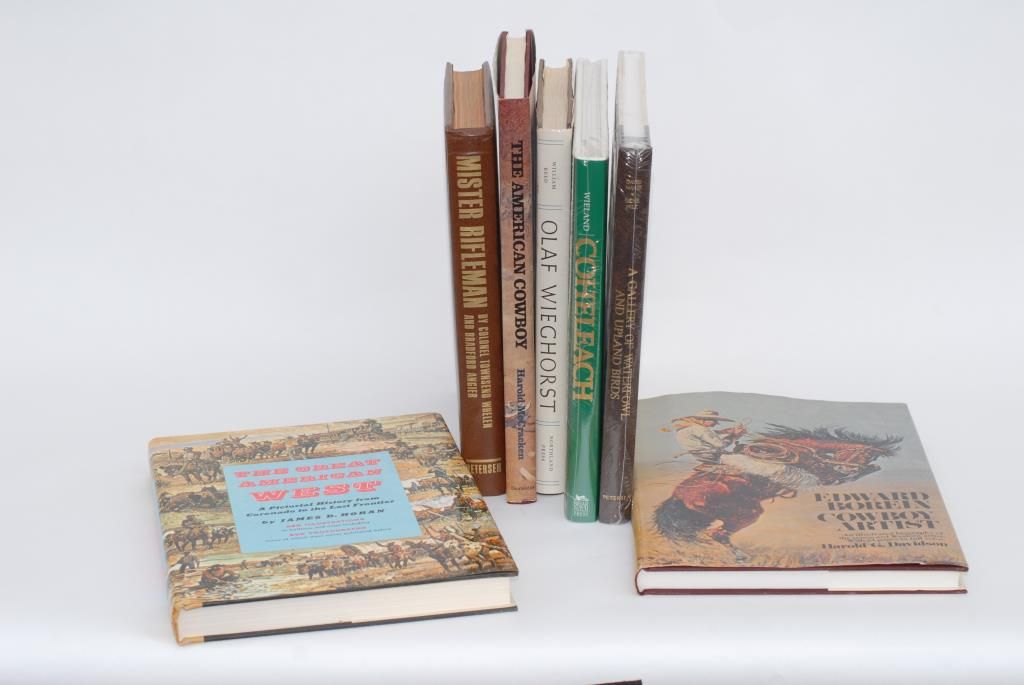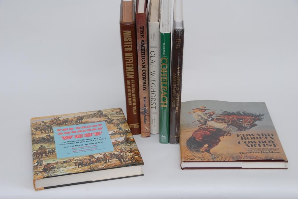 Lot of approx. 12 books, mostly oversized and a number deluxe editions, on Western and Wildlife artists like Edward Borein, Olaf Wieghorst, Wieland Coheleach and Harry Jackson and several on firearms; from thepersonal library of the late Robert E. Petersen’s home in Beverly Hills, CA. From the estate of Robert E. Petersen. Est.: $250-$500.