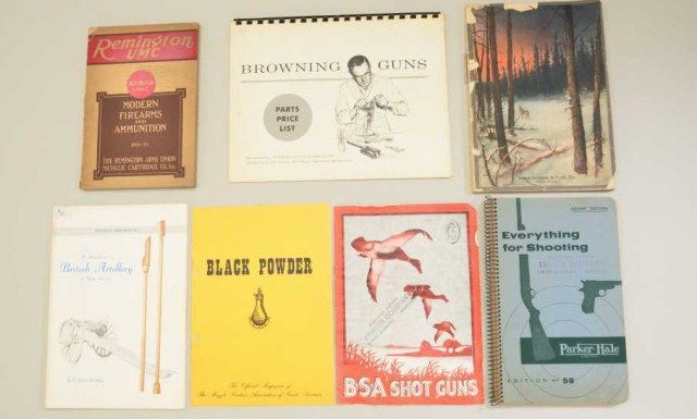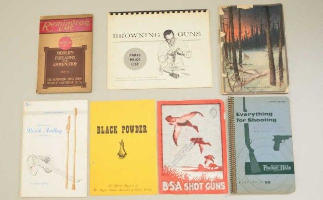 Lot of approx. 12 gun and fishing-related catalogs, flyers, etc. including Walker's "The Art and Craftsmanship of Fly Fishing"; Remington/UMC 1912 booklet on the company's history; a 1915 Outfitting Catalogue byAbercrombie & Fitch; Remington/UMC Firearms and Ammo catalog for 1918-1919; a 1928 B&M Products Handbook for the rifle and revolver shooter; a Brownell's catalog; a BSA Shot Guns pamphlet, etc.; lots of greatinformation. Est.: $100-$200.