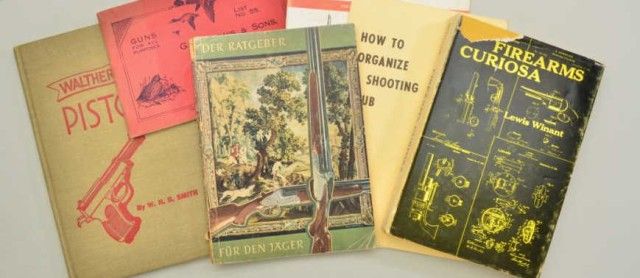 Lot of approx. 12 misc. gun related catalogs, books and flyers including a 1907 Bannerman’s catalog; Smith’s book on Walther Pistols; Winant’s Firearms Curiosa; a 1932 list No. 55 pamphlet from English dealer G.E. Lewis & Sons; “American Socket Bayonets 1717-1873 by Webster and other advertisers including info on Browning fishing rods, Marlin guns, CZ firearms, etc.; a wealth of info and fodder for the gun show table.Est.: $50-$75.
