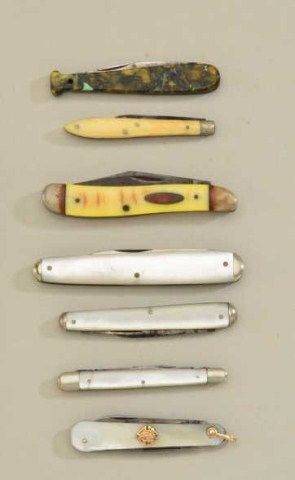 Lot of approx. 15 misc. folder and pocket knives and older dagger; plus five pearl handled Universal small clip point knives each approx. 6” overall with approx. 3” blades in jeweler’s cloth holder; several ofthe miniature folders have pearl scales. Est.: $100-$200.