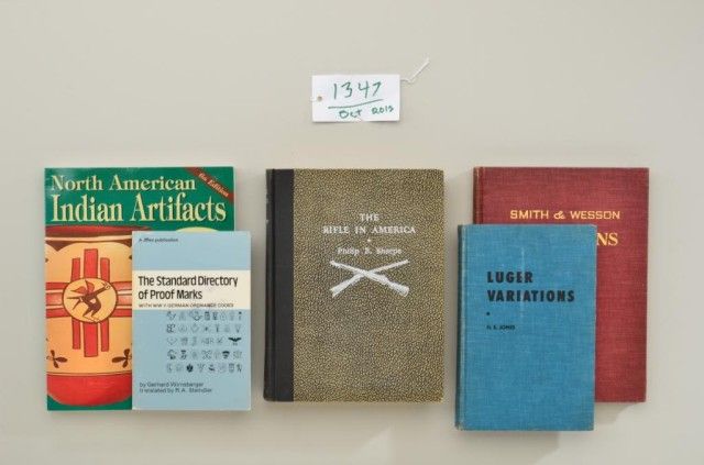 Lot of approx. 19 collector books, mostly hardback and many out-of-print including “L.D. Nimschke, Firearms Engraver” by Wilson; “Confederate Presentation and Inscribed Swords & Revolvers” by Hartzler; Brophy’sbook on “Marlin Firearms”; “The Guns of Remington” complied by the Remington Society of America; “Colt: An American Legend” and “The Peacemaker” both by Wilson; “Colt Single Action” by Adler and other informative works for the serious collector. Est.: $300-$600.