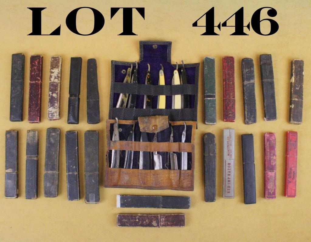 Lot of approx. 22 old straight razor two piece cardboard sleeves by various makers and agents from fair to good overall condition plus two leather folders with straight razors contained; first “kit” has 6 differentrazors by various makers and in overall fair + to very good condition; the second “kit” containing another 6 razors by various makers, 3 with handles and three just the blades (this grouping more worn than thefirst “kit” with several pieces in relic-like condition. Great for display or the early barber shop collector. Est.: $100-$200.