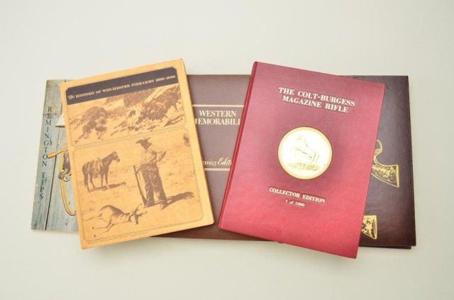 Lot of approx. 23 collectible firearms and Western reference books, many hard cover and most out-of-print including “Winchester Engraving” by Wilson; “Sharps Firearms” by Sellers; “The William Locke Collection”;“Dance and Brothers” by Wiggins; “The Colt-Burgess Magazine Rifle” by Maxwell; “Freund & Bro. Pioneer Gunmakers to the West” by Balentine; “Cowboy Culture” by Friedman; “Packing Iron” by Rattenbury; “Samuel ColtPresents” by Wilson; “The Stagecoach Museum Gun Collection”; “The .45-70 Springfield” by Frasca & Hill; etc.; great research materials. Est.: $300-$600.