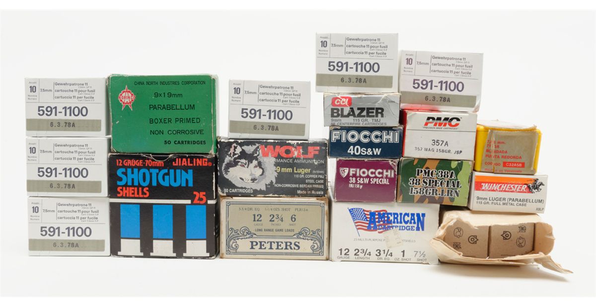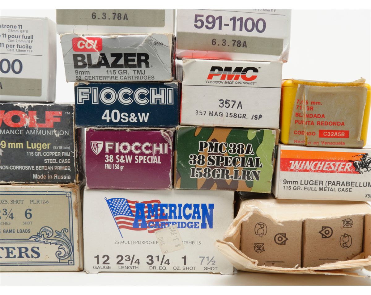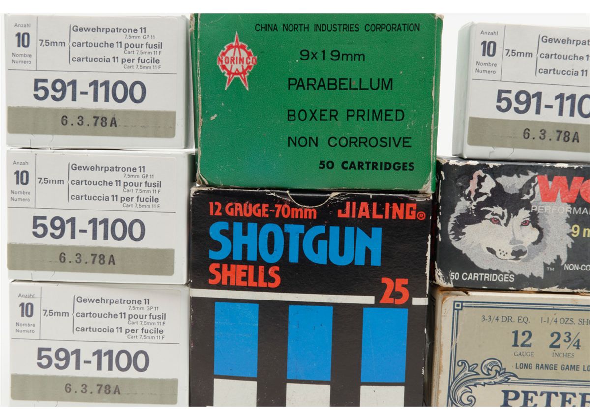 Lot of approx. 24 boxes of misc. ammo including 7.5mm, 9mm, .38 Special and 12 gauge shotgun shells. Est.: $50-$100.