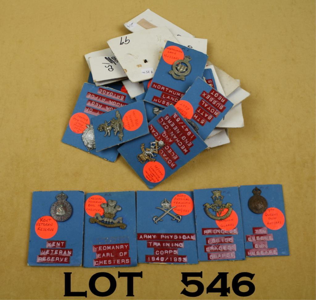 Lot of approx. 30 British metal uniform insignias, mostly different, covering the 1900’s and some possibly earlier; many identified and from many service areas; from a lifetime collection and seldom seen in this quantity offered at auction. Est.: $150-$300.