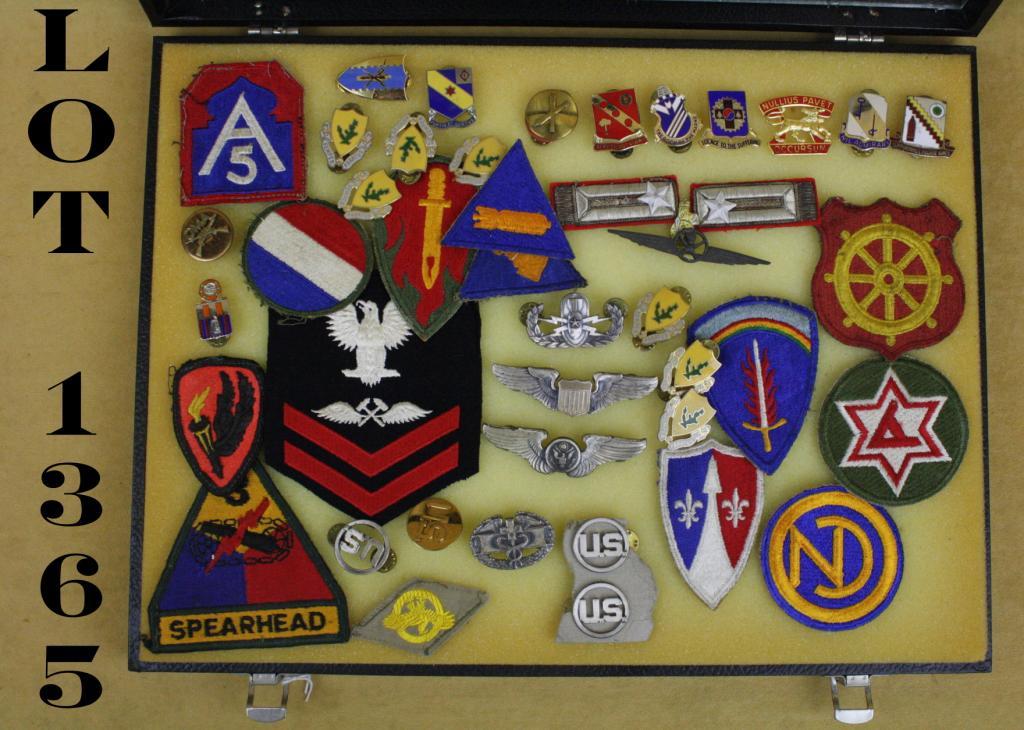 Lot of approx. 40, mostly U.S., military patches and pins contained in a large riker case including flight insignias, US uniform collar pins, unit designation patches , etc. Est.: $100-$200.