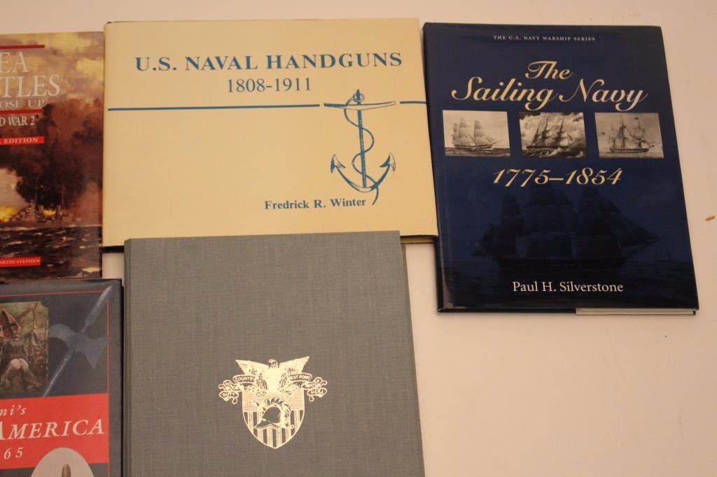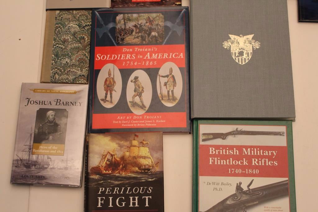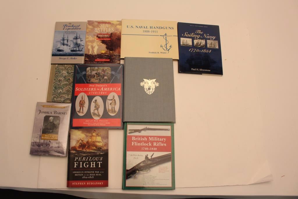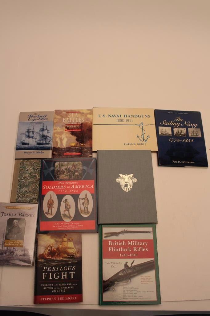 Lot of approximately 10 hardback books primarily on military-related subjects including Troiani’s “Soldiers in America”; “British Military Flintlock Rifles” by De Witt Bailey; “The Sailing Navy/1775-1854”bySilverstone; Winter’s “U.S. Naval Handguns/1808-1911”; “Joshua Barney/Hero of the revolution and 1812” by Norton and others. Est.: $50-100