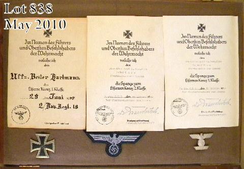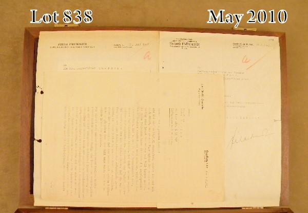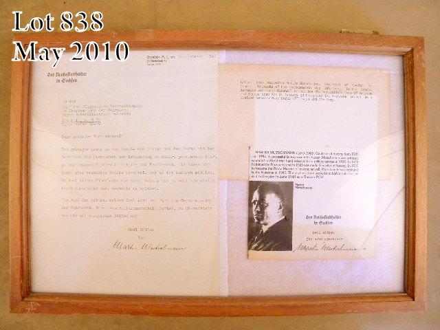 Lot of assorted WW II original German documents in three beautiful wood and glass display cases including three official documents that may be military passes or notices, each Nazi stamped with two dated 1941 and one dated 1938 along withthree Nazi uniform objects, two metal and one material; two SS referenced letters dated 1943, one on letterhead of Fritz Prediger, the other on Richard Hildebrandt letter head, a notice on the letterhead of Kurt Daluege, Police General, datedNov. 30, 1937; a letter on the stationary of Karl Wahl, Gauleiter, dated 1941 and a letter signed by Martin Mutschmann (1879-1948) dated Feb. 21, 1941, thanking General Reinecke of the Oberkommando der Wehrmacht for a battlefield tourin Belgium and France provided to German Gauleiters of which Mutschmann was one over Saxony from 1925 to 1945 when he was captured by the Russians and held as a POW until his death in 1948. An important grouping of WW II militaryhistorical papers. Est.: $250-$500.