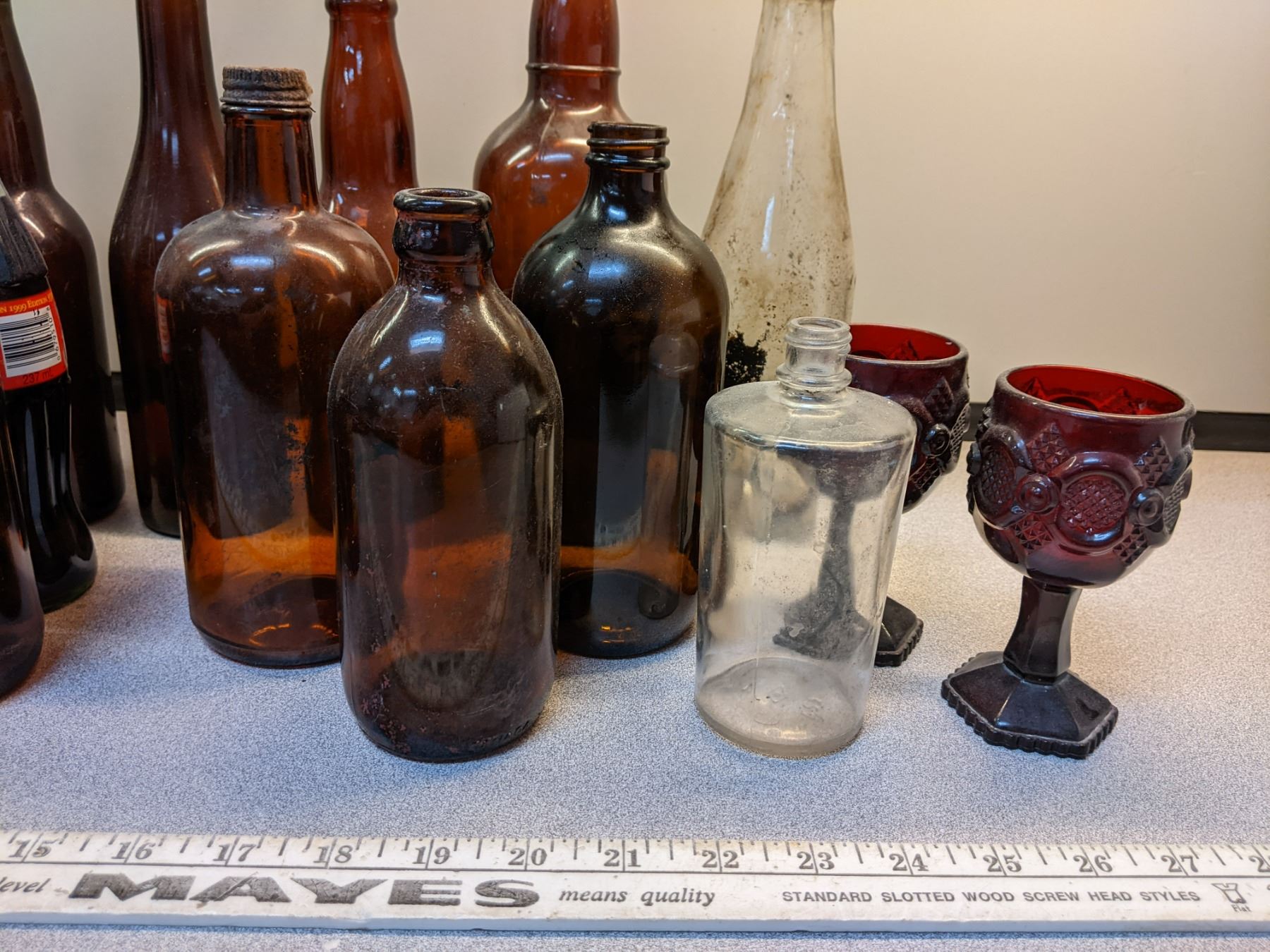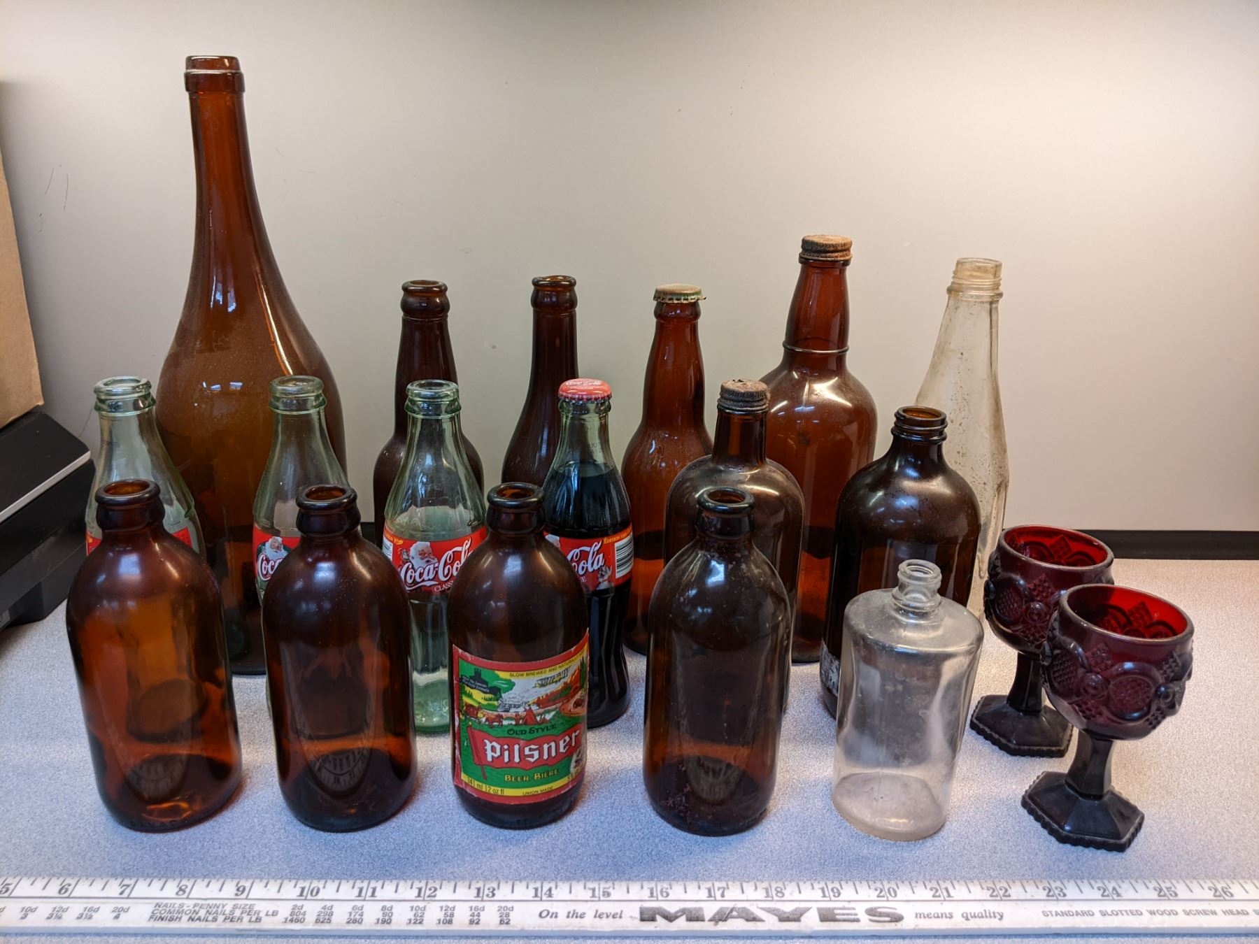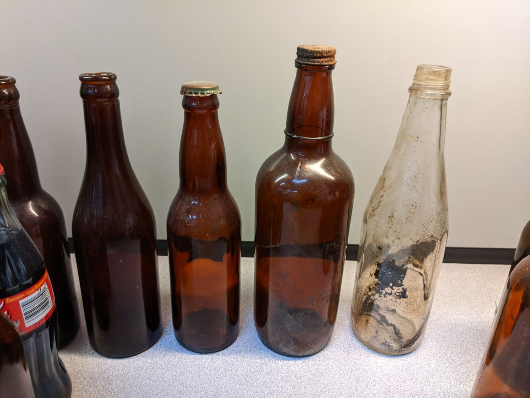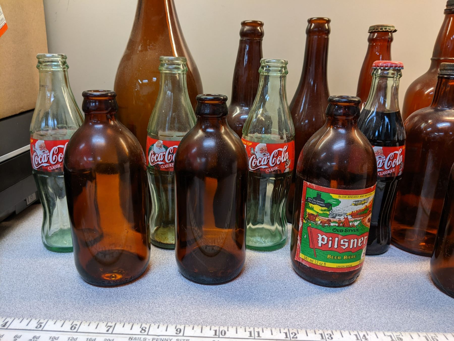 Lot of assorted bottles - Coca-Cola, Pilsner, brown beer bottles, etc.