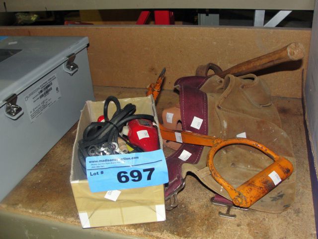 Lot of assorted tools, carpenters belt, lifting hook and misc tools