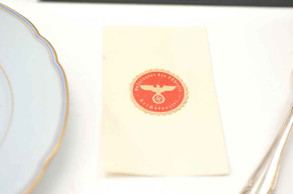 Lot of authentic WWII items formerly property of Hermann Goring, Reichsmarschall of Germany. The plate is marked Richard by Binori with the Goring crest. The provenance indicates the plate came from his sister’sestate by way of the Hermann Goring historical auction, Germany. The lot includes a knife and fork with the Goring Baronial crest, marked Hulse-1800 fine silver. There is a telegram and four pieceNazi seal set. Guaranteed authentic with a 60 day return priviledge. From an old-time collector. $1,500-$3,000.