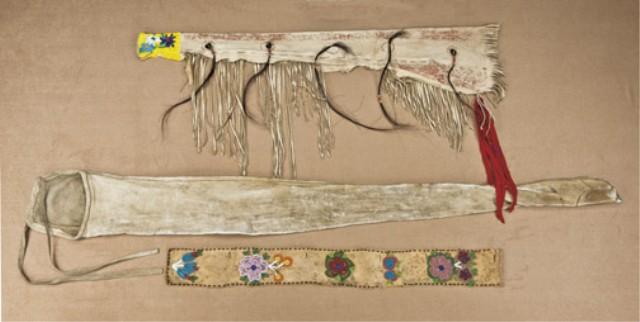 Lot of beaded American artifacts consisting of a carbine scabbard, with hair drops, red okra color, beaded florals at tip, measuring approx. 33” by 6-3/4” across. Fits a lever action carbine well, Indian tanned, circa approx. 1900, beadwork somewhat later. Fair condition. Along with a buckskin rifle scabbard, approx. 45” in length, with long ties, white man made, circa late 19th century. Beaded belt showing large florals, approx. 3” in width by 28” in length. Fair condition, late 19th to early 20th century, and a pair of post-WWII beaded leggings, probably Northern Sioux, measuring 32”, beaded panels approx. 2” by 27”. Nice trim, machine stitched, Indian made but late. Est: $350 - $700