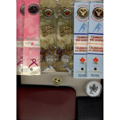 Lot of bookmarks 2005 Poppy 25¢ (2), 2006 Lucky Loonie (2), 2006 Breast Cancer (2), 1908-98 sml 1 once ,9999 and 3 cents 150th Anniversary first Canada Post stamp,