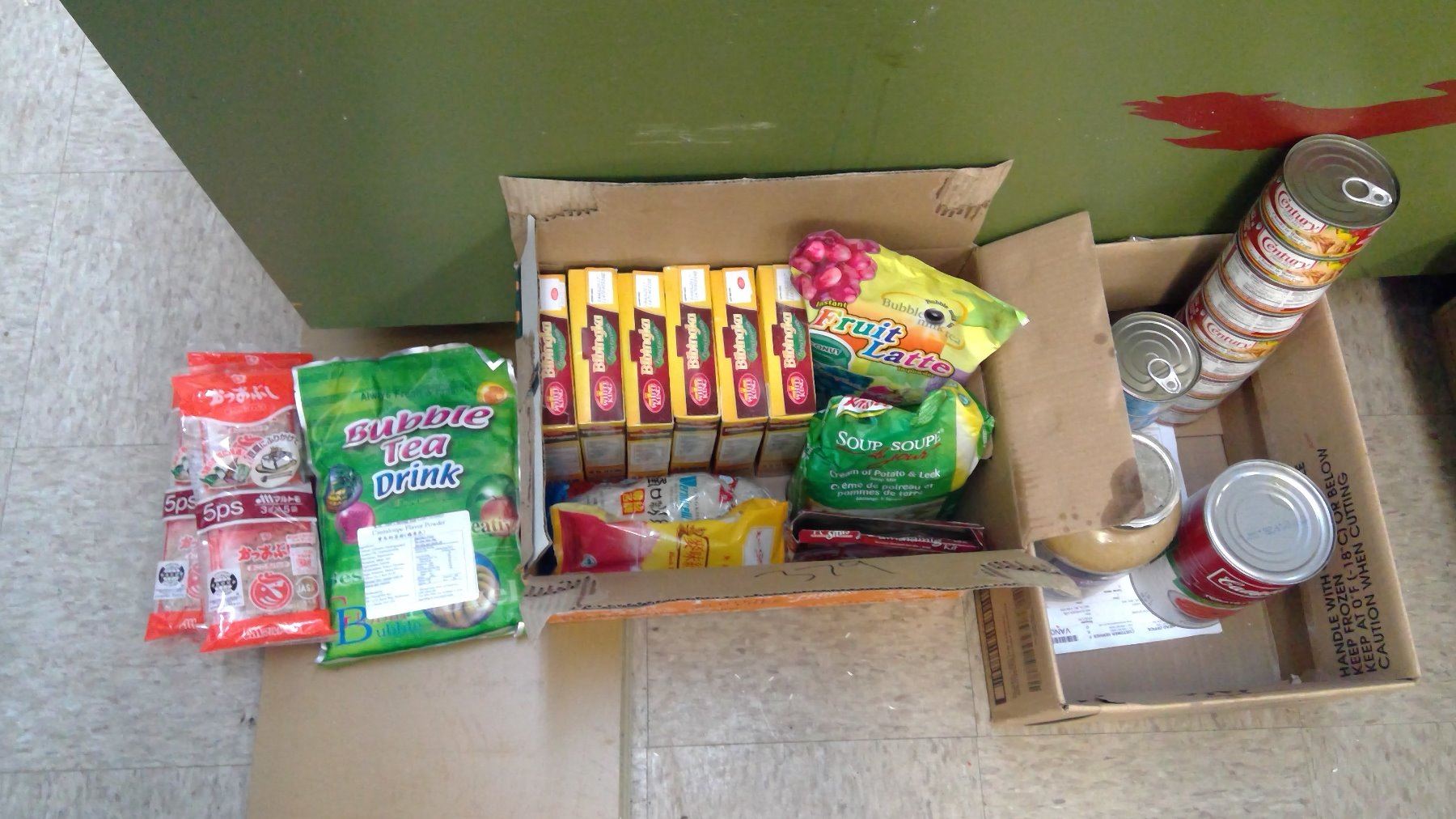 Lot of bubble tea, soup mix, cake mix, tuna, etc