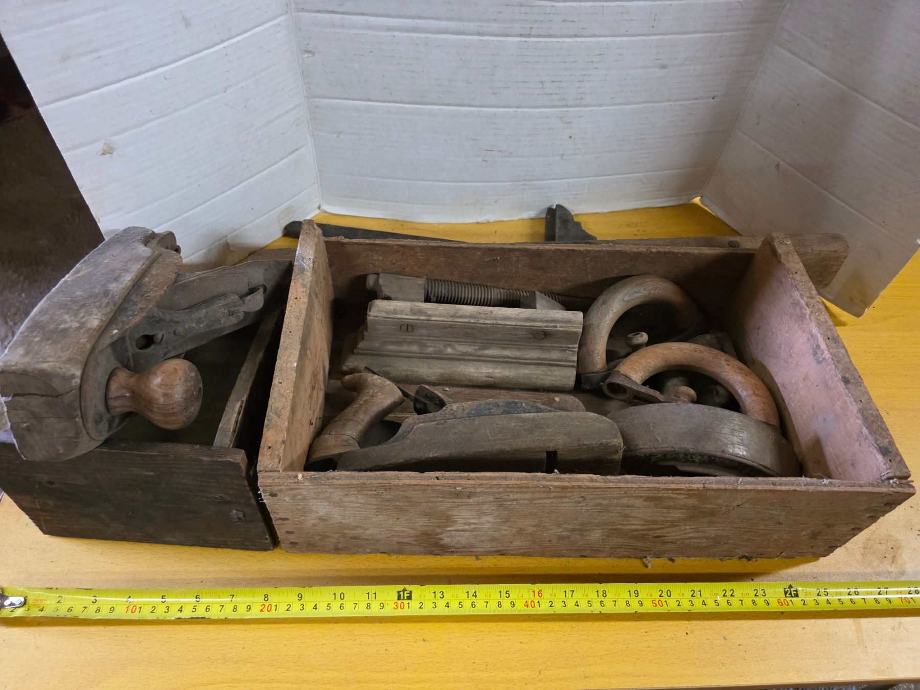 Lot of carpentry tools, sad irons, and crate