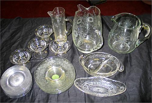 Lot of clear etched glass pitchers and other items including four etched sherbets, six etched plates 5" across and six etched plates 6 3/4" across