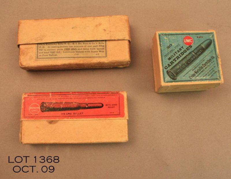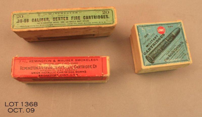 Lot of collector ammo boxes including a full box of Winchester .38-56 cal. (20 rounds) in overall very good condition; a full box of UMC .43 Spanish cal. (20 cartridges) in overall very good condition and an empty box by Remington/UMC forthe 7mm caliber rifle in good condition. Est.: $50-$100.