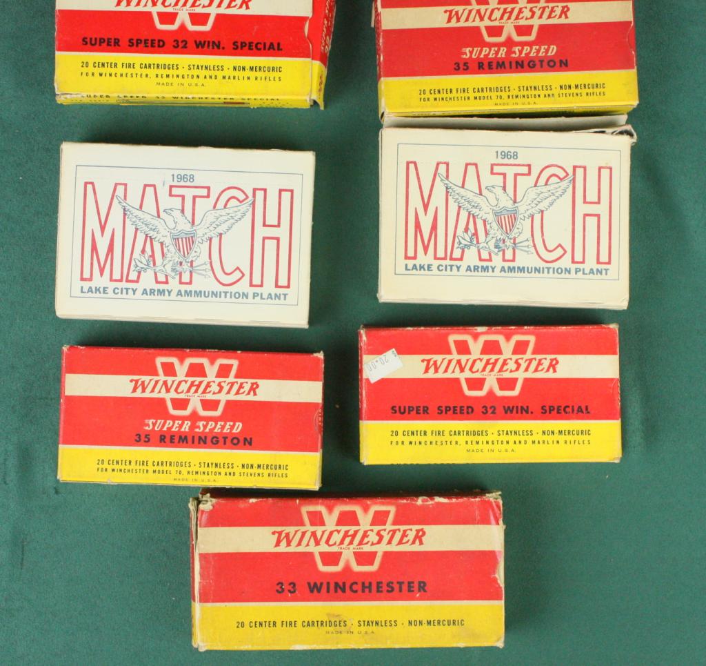 Lot of collector ammo including five boxes of  Winchester: two in .35 Remington, two in .32  Winchester Special and one in .33 Winchester  caliber; also two boxes of .30 caliber Match  cartridges by Lake City Army AmmunitionPlant. Est.:  $75-$150.