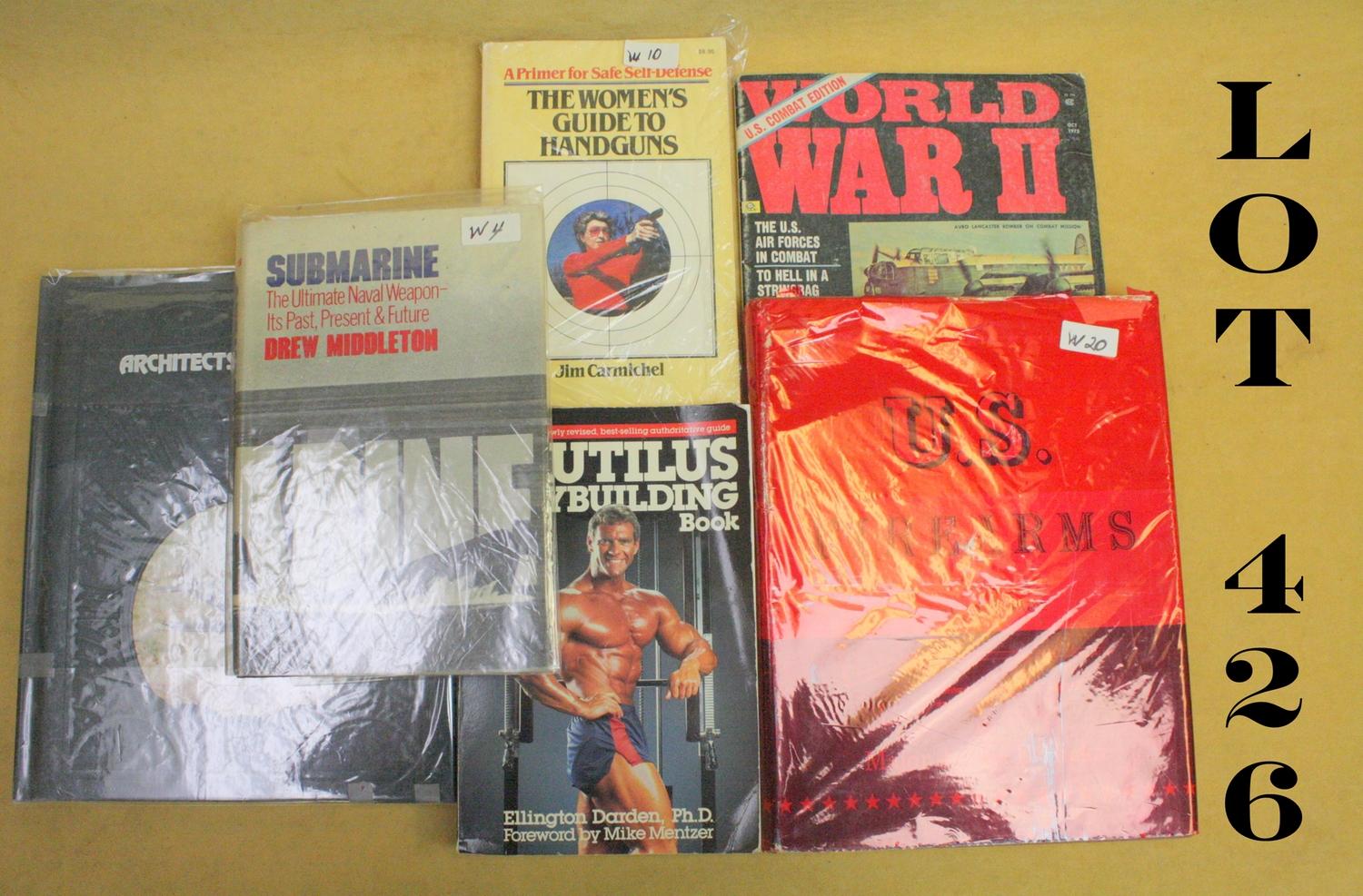 Lot of collector reference books and pamphlets including approx. 15 Gun Report magazines, Buchheim’s “U-Boat War” (hardback), Tim-Life’s “Architects of Air Power, “U.S. Firearms 1776-1956 by Hicks(hardback), and a grouping of several dozen misc. pamphlets and materials on the American Civil War, Colt firearms, gun collecting, the NRA, etc. Est.: $100-$200.