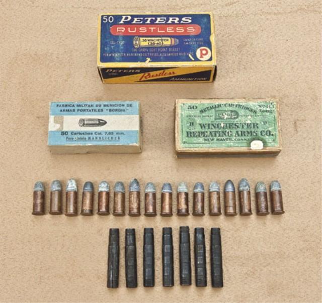 Lot of collector’s cartridges consisting of; 1) Peter’s .38-40 Winchester centerfire cartridges marked for Winchester Marlin, and Colt rifles and various revolvers. Blue and yellow label. Opened. Half box. 2) Box of .41 long cartridges, Stetson patent, by Winchester repeating arms co. Opened full box, for early revolvers. 3) Box of cartridges for 7.65 Manlicher by Borghi, opened half box. 4) .44 Henry rimfire loose cartridges, various US, H, &U headstamps. 16 total. Normal aging, no cleaning, good for display. 5) Seven headless shell extractors, US Military Issue type for Trapdoor Springfield. Est: $300 - $600
