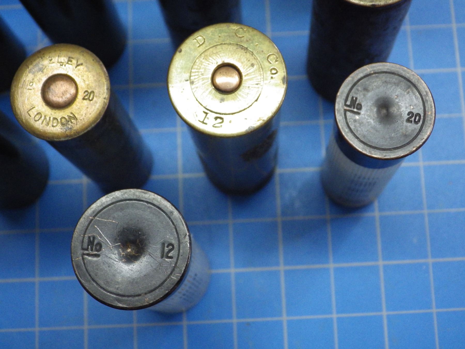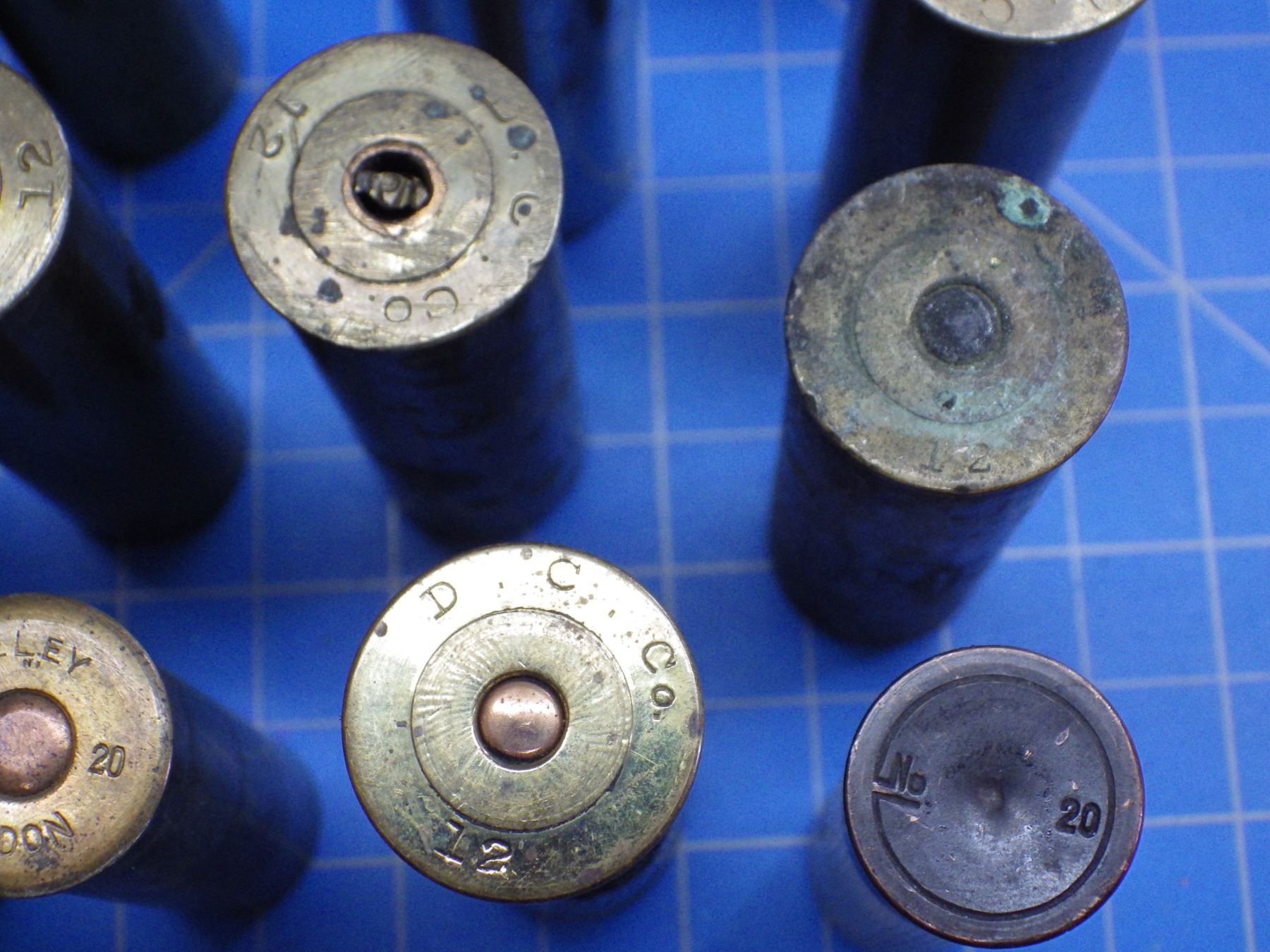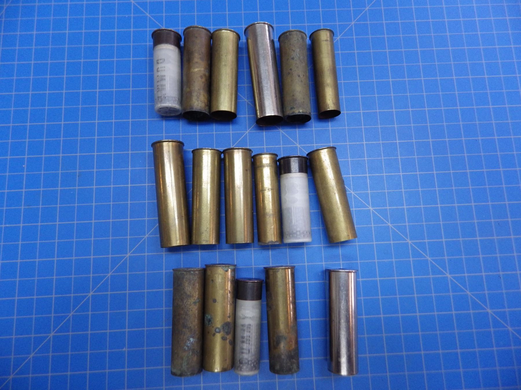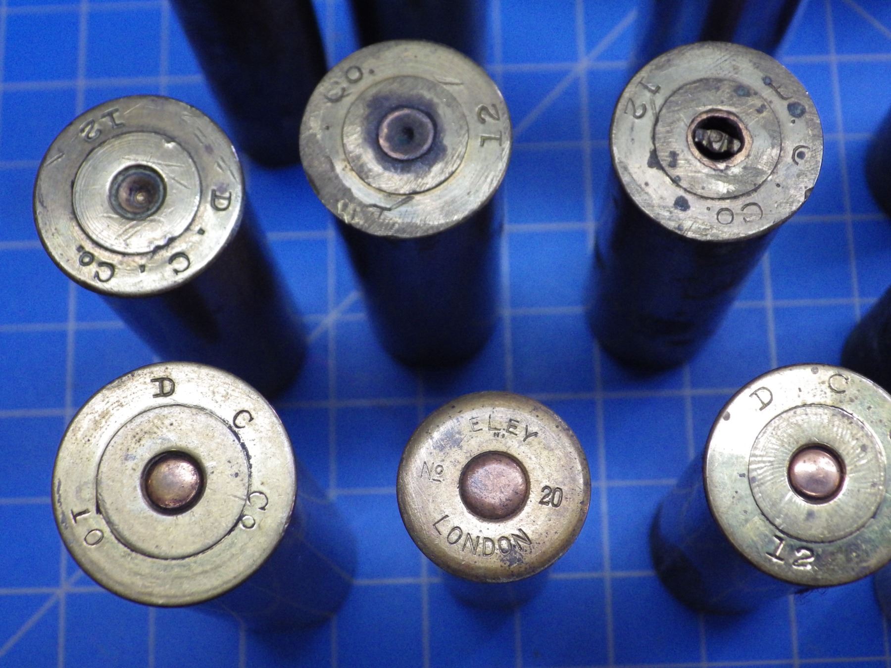 Lot of collectors shotgun cases consisting of 9 D C Co. 12 gauge brass shotgun shells, 1 D C Co. 10 gauge brass shotgun shell, 2 D   Co. 20 gauge brass shotshells,  2 Parker Bros. CT nickel shot shells, one 12 gauge, one 10 gauge;  2 dummy 12 gauge cartridges and 1 dummy 20 gauge cartridge