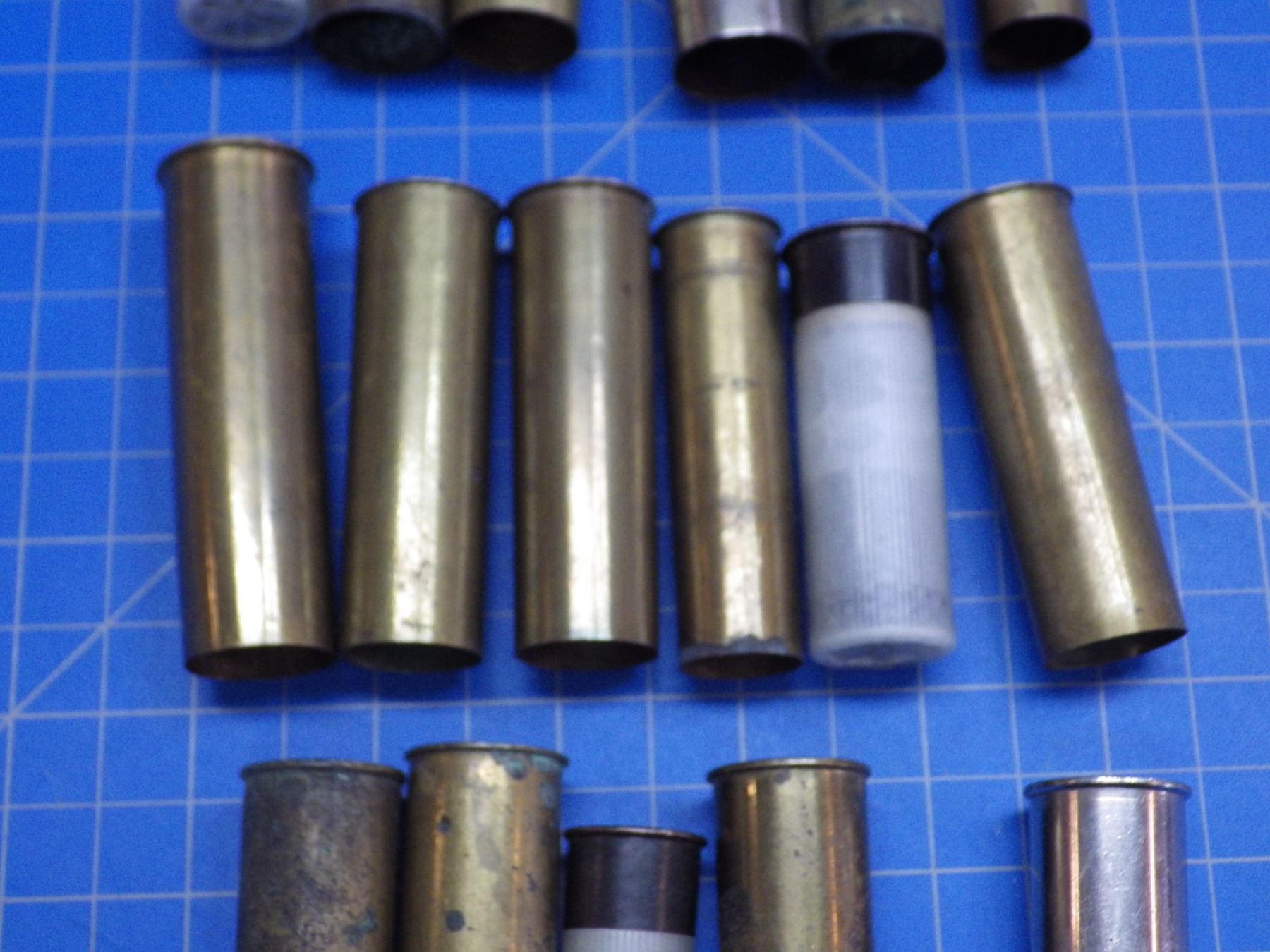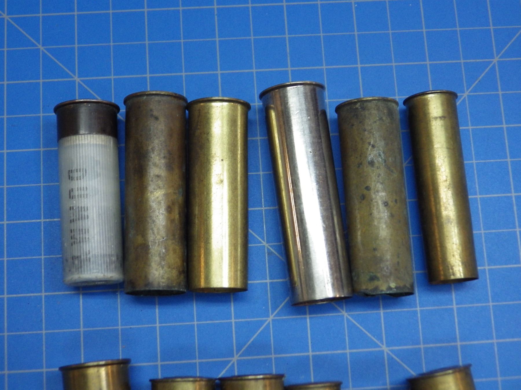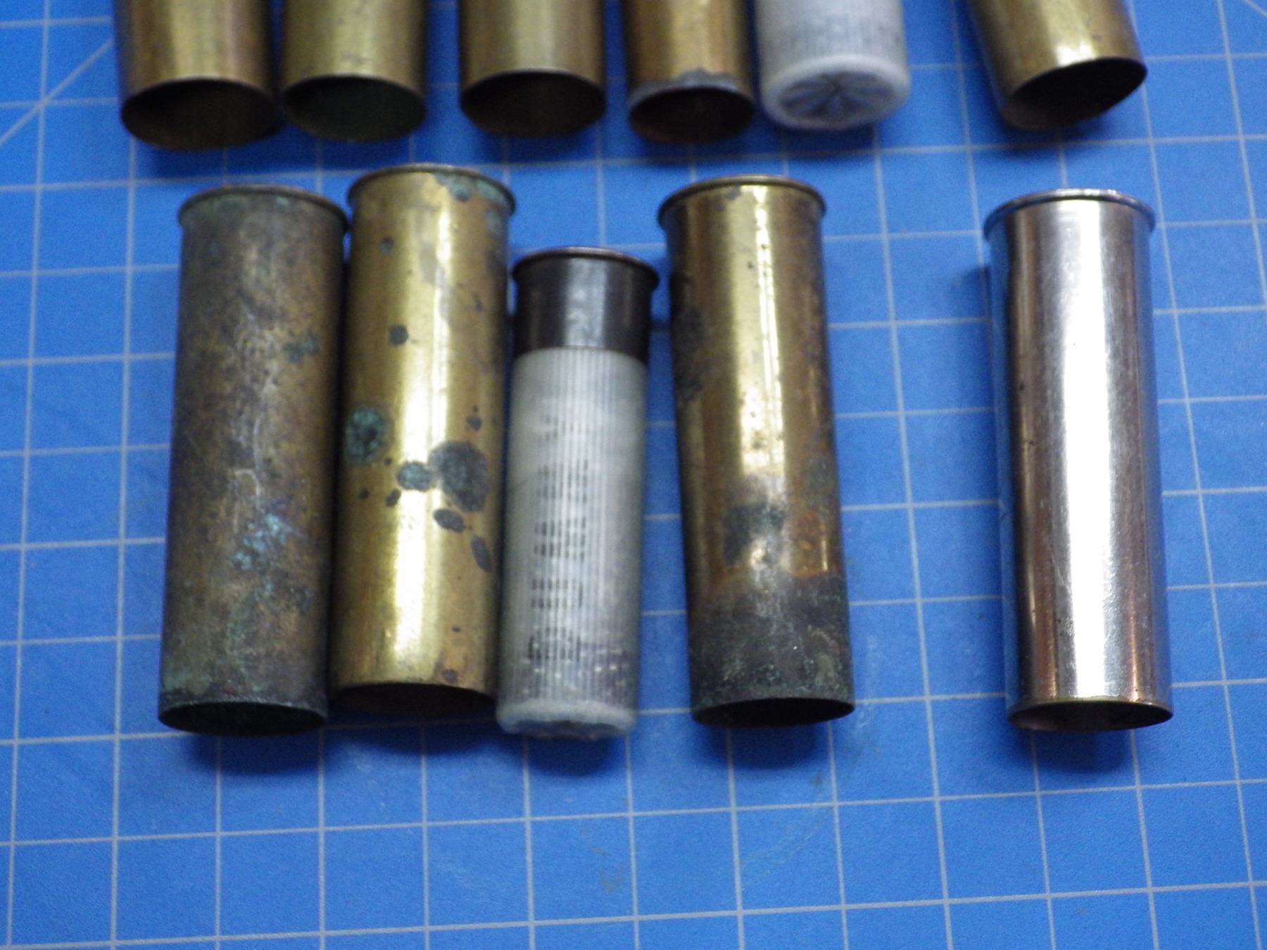 Lot of collectors shotgun cases consisting of 9 D C Co. 12 gauge brass shotgun shells, 1 D C Co. 10 gauge brass shotgun shell, 2 D   Co. 20 gauge brass shotshells,  2 Parker Bros. CT nickel shot shells, one 12 gauge, one 10 gauge;  2 dummy 12 gauge cartridges and 1 dummy 20 gauge cartridge
