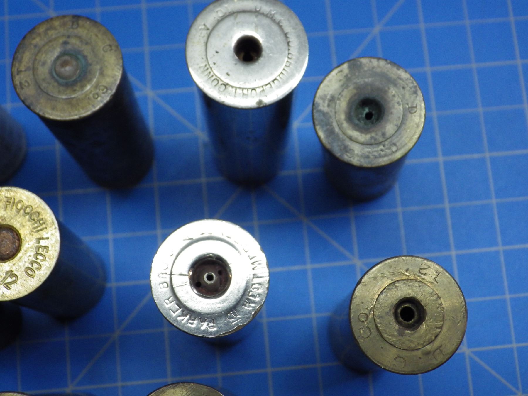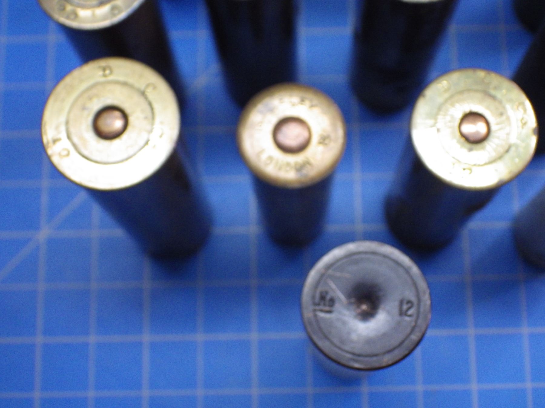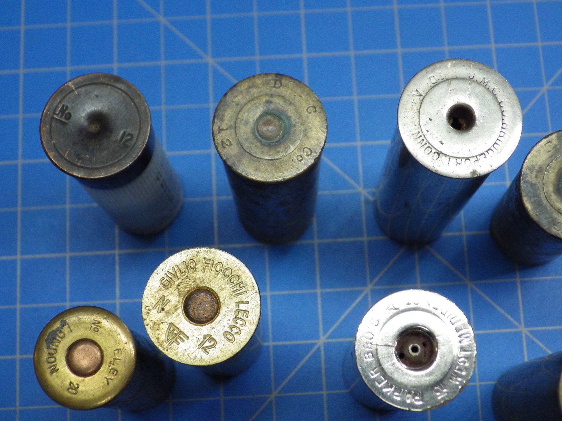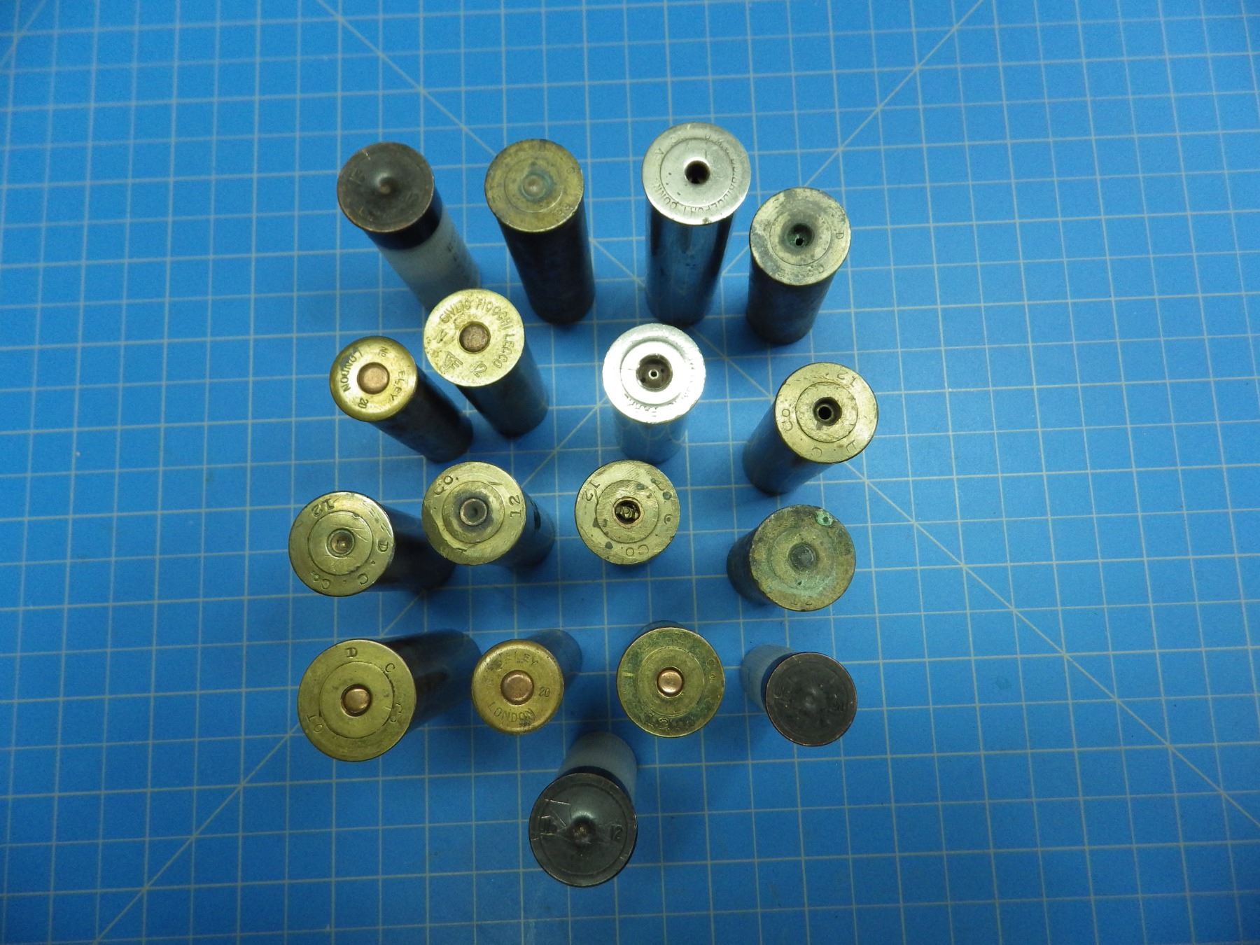Lot of collectors shotgun cases consisting of 9 D C Co. 12 gauge brass shotgun shells, 1 D C Co. 10 gauge brass shotgun shell, 2 D   Co. 20 gauge brass shotshells,  2 Parker Bros. CT nickel shot shells, one 12 gauge, one 10 gauge;  2 dummy 12 gauge cartridges and 1 dummy 20 gauge cartridge