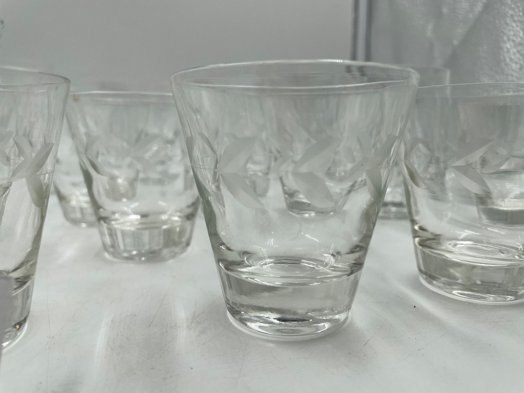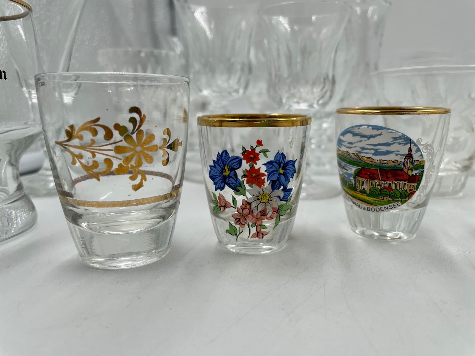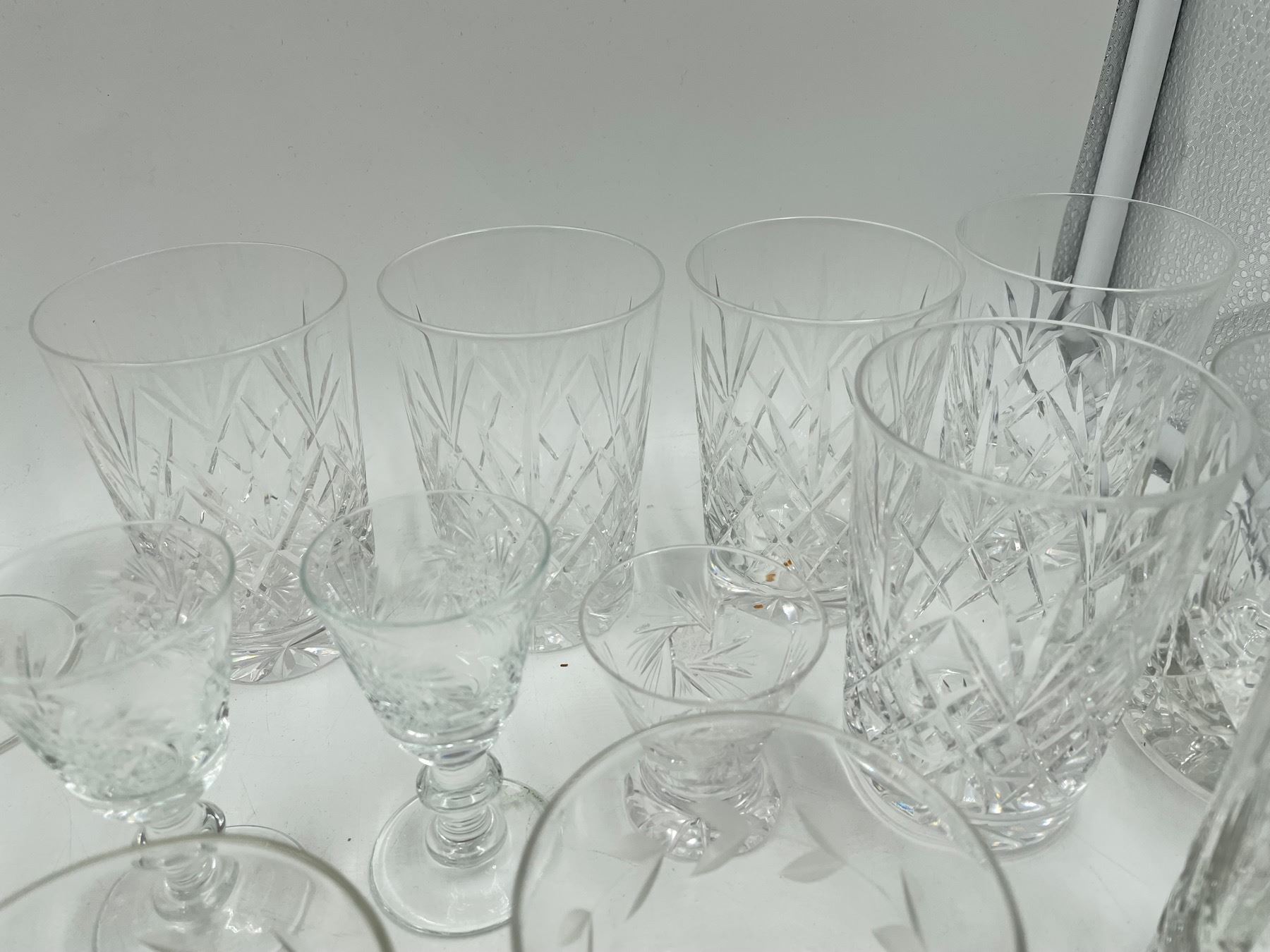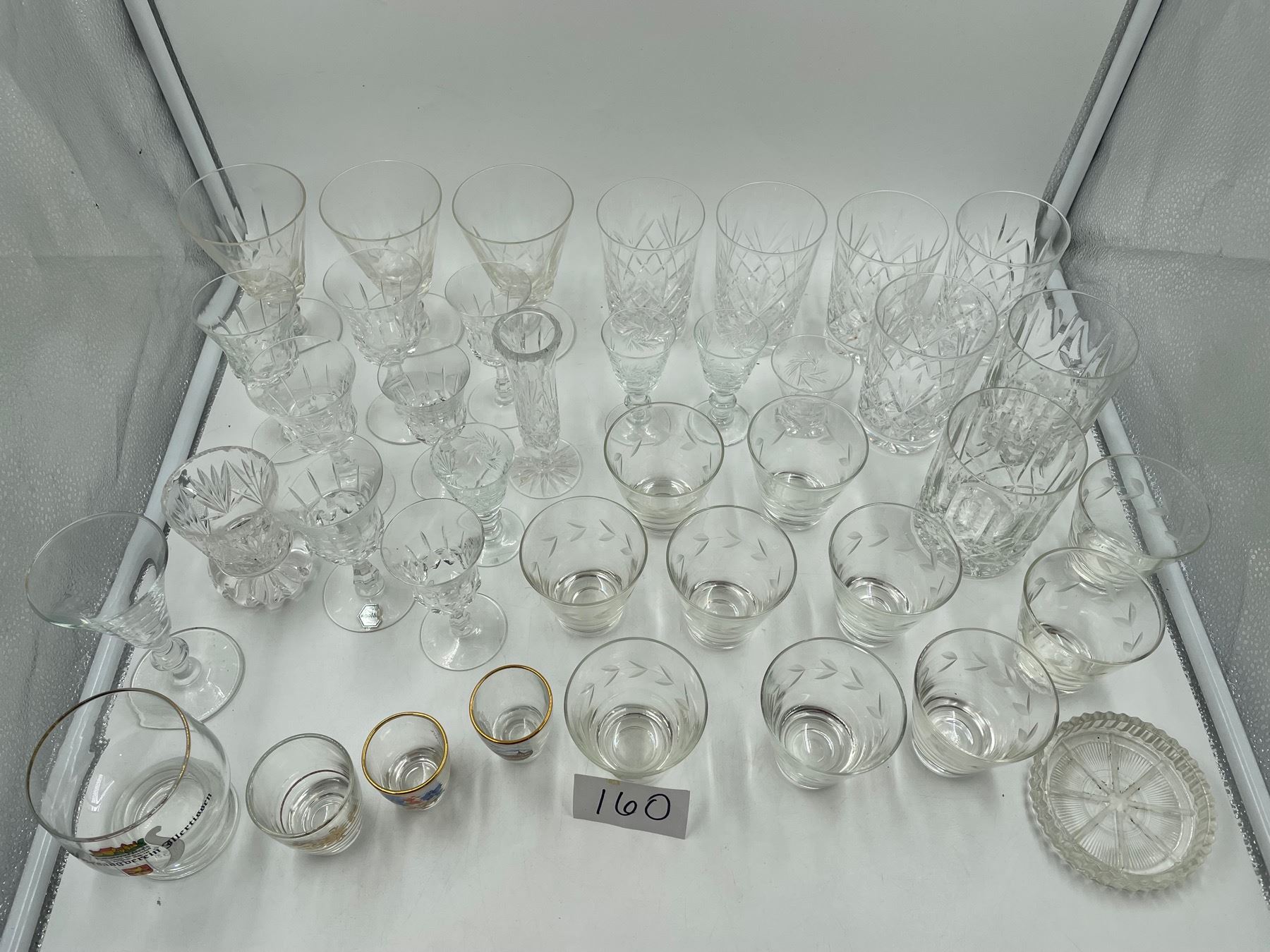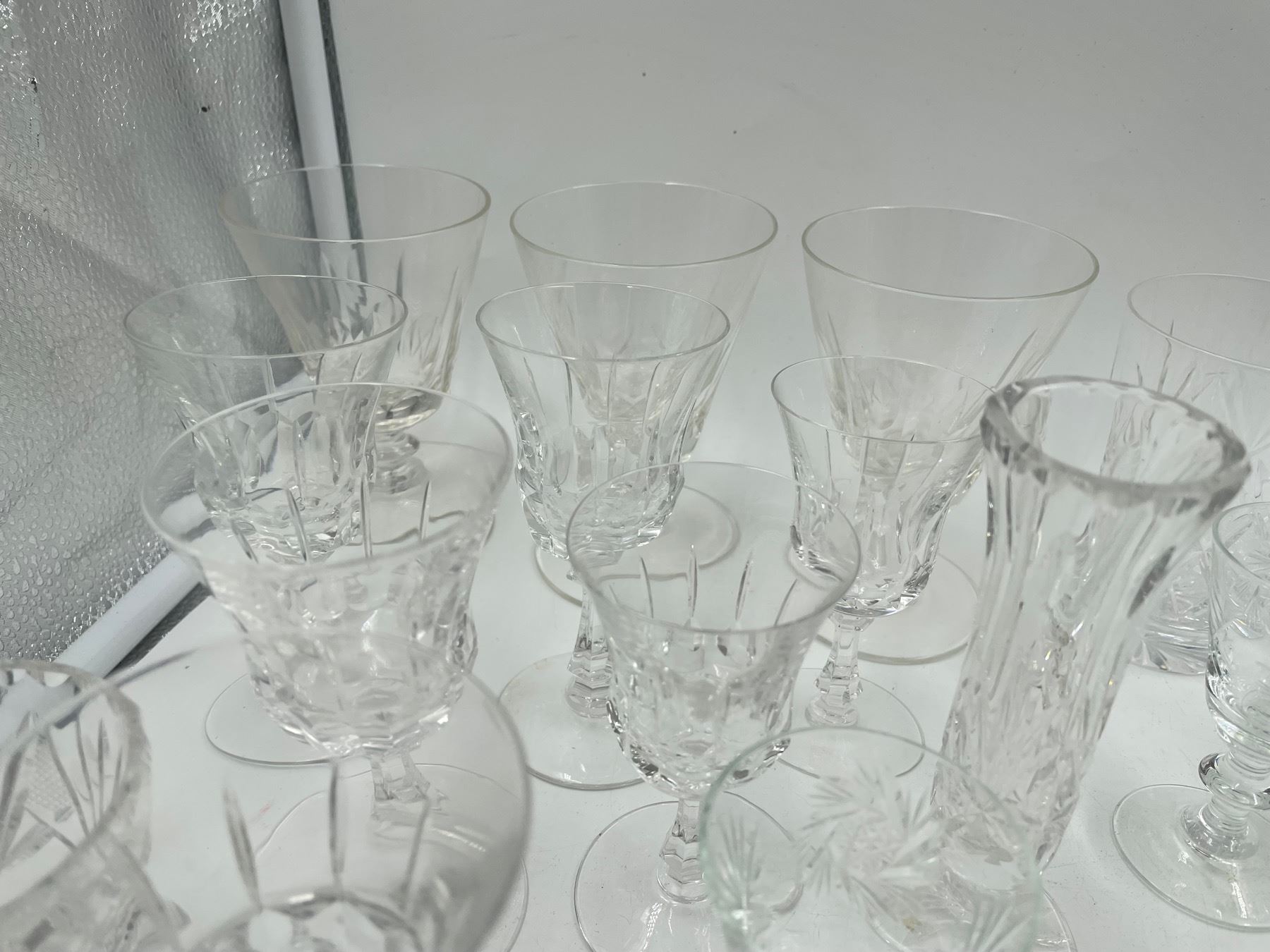 Lot of approx 40 pcs of crystal barware includes a few glass pieces: tall and short highball glasses, shot glasses, cordial glasses,, a small stem vase and more lovely pieces. All are free of chips or damage.