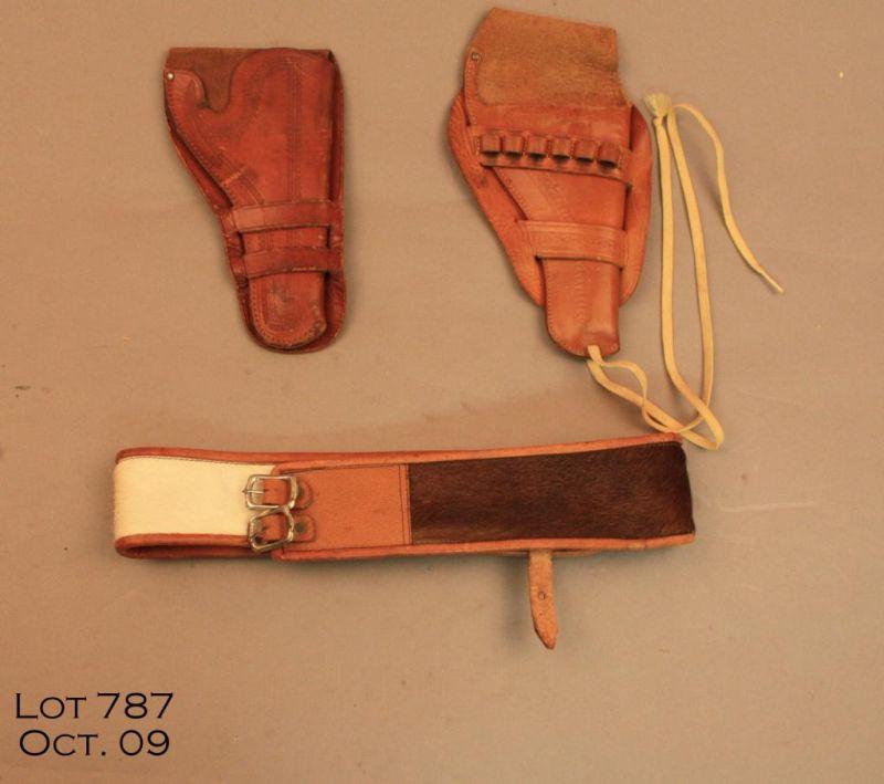 Lot of double loop western style holsters for large frame revolvers circa 1890 - 1910. One shows large. cartridge loops and tie down added. Border Wars Era along w/ Mexican hide on money belt w/double buckles. Est. $200 - $400