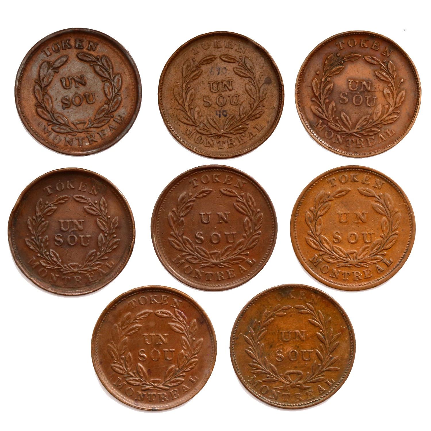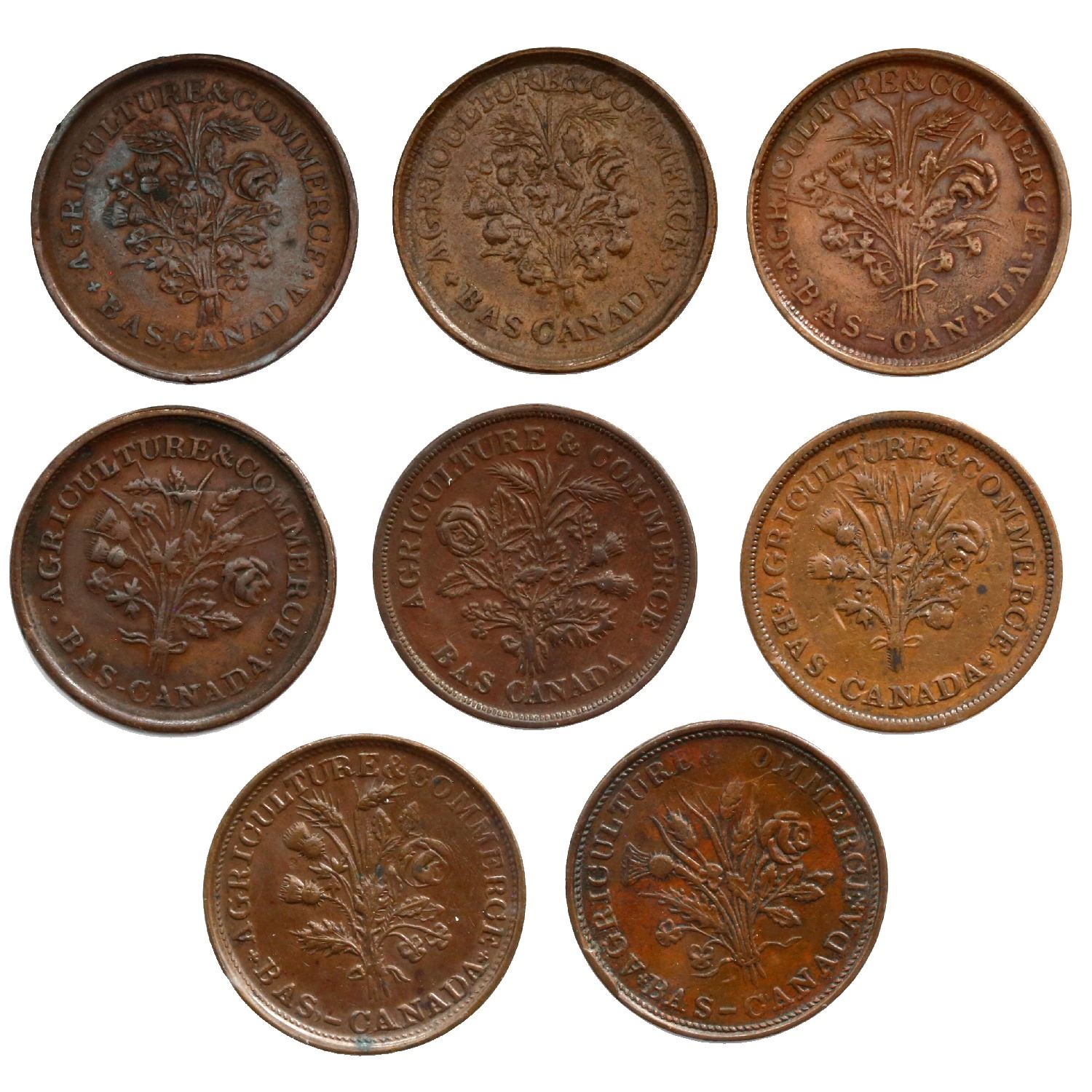 Lot of eight Montreal, Lower Canada, copper  bouquet-sou  tokens, Agriculture & Commerce, no date (1
