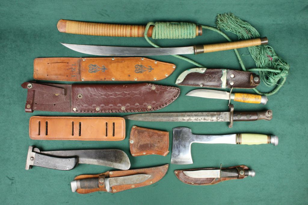 Lot of eight misc. knives including two  Kinfolks belt knives with sheaths, a huge  folder with wide blade approx. 10”, a Mora  belt knife with sheath, a Ka bar hand axe  with tooled leather cover, a British bayonet, a Green River skinning knife, a Southeast  Asian long knife with wood sheath and woven  hanging cord and three leather sheaths, one  marked “IXL” Sheffield, England.  Est.:   $100-$200.