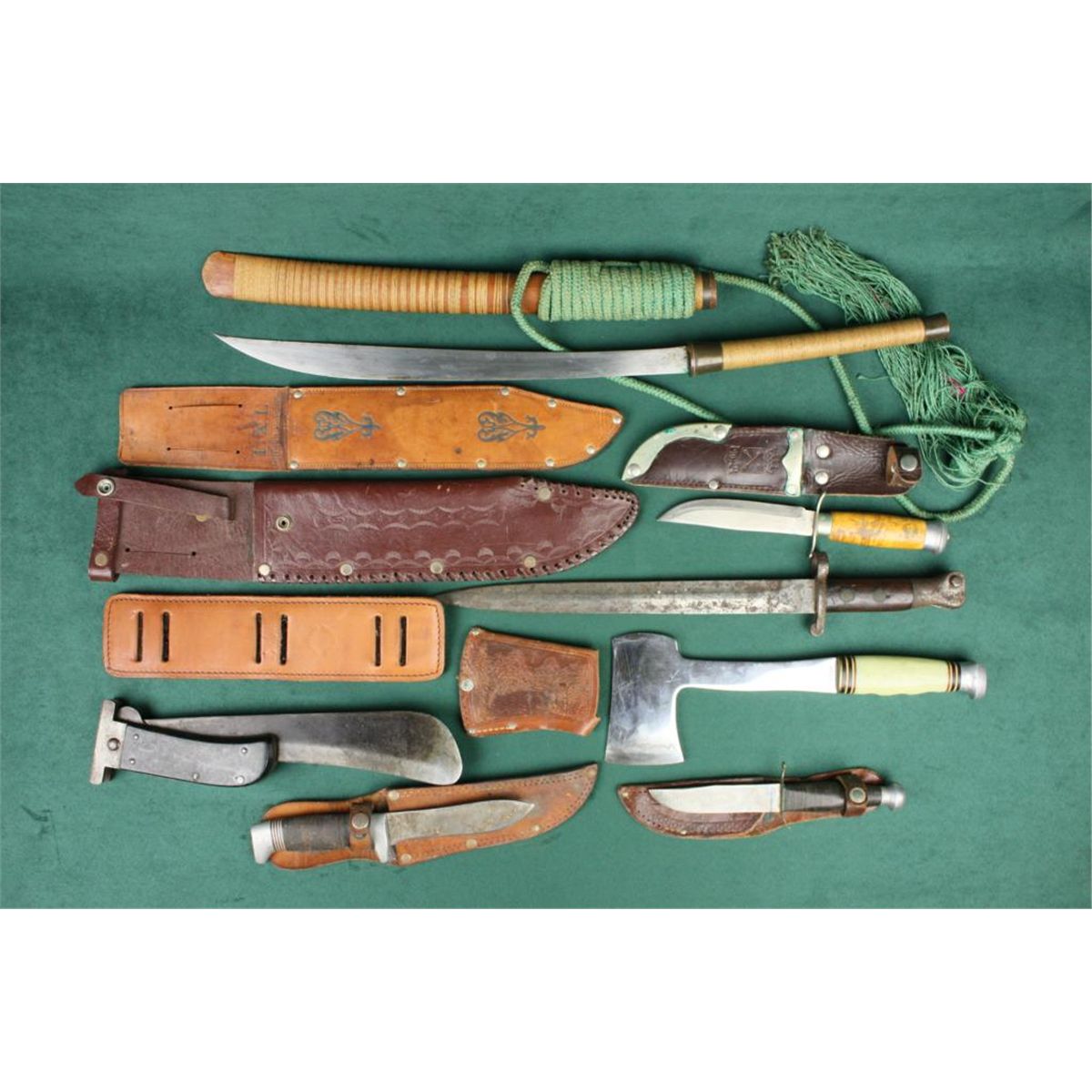 Lot of eight misc. knives including two Kinfolks belt knives with sheaths, a huge folder with wide blade approx. 10”, a Mora belt knife with sheath, a Ka bar hand axe with tooled leather cover, a British bayonet, a Green River skinning knife, a Southeast Asian long knife with wood sheath and woven hanging cord and three leather sheaths, one marked “IXL” Sheffield, England. Est.: $50-$100.